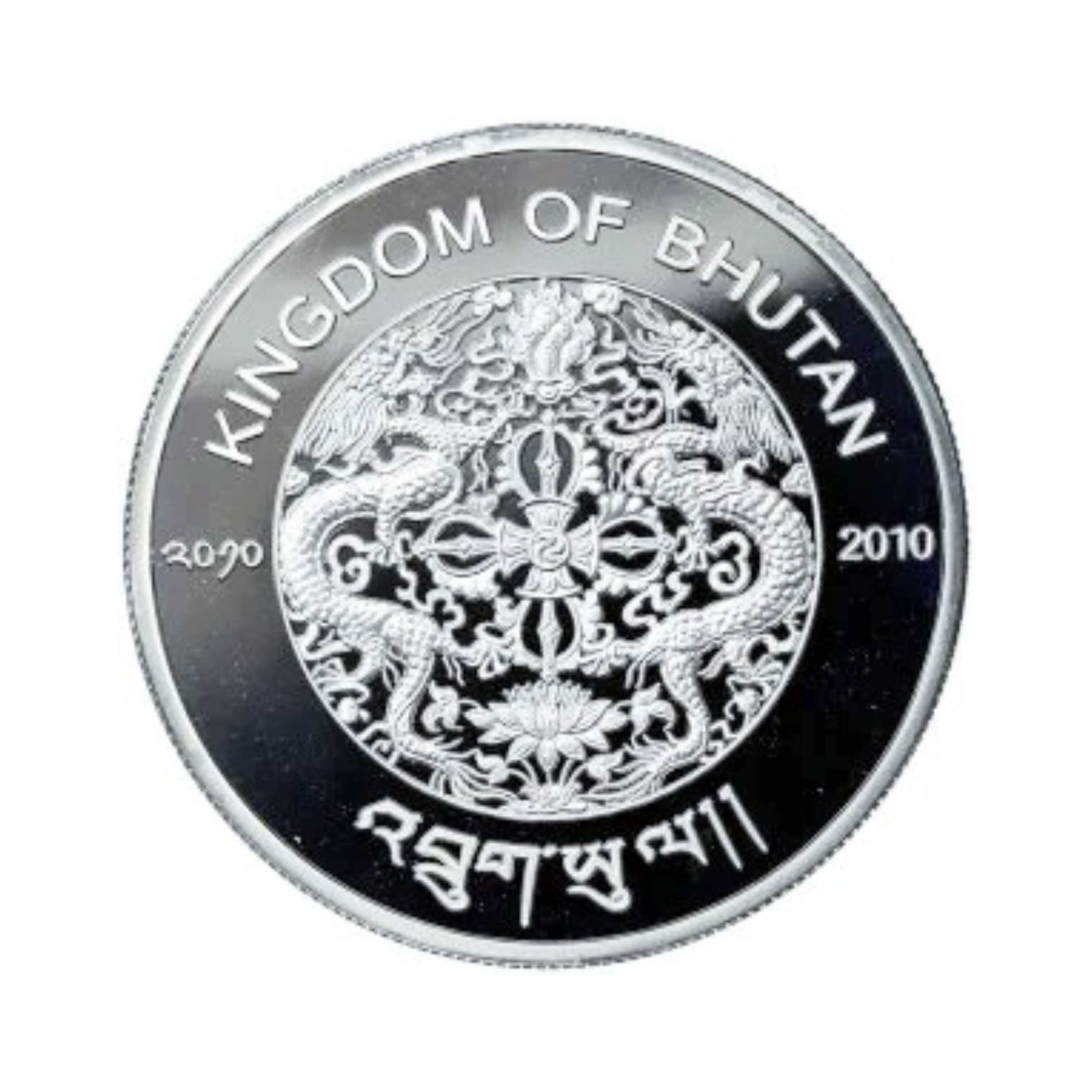 Feine Gravuren und spiegelnde Flächen unterstreichen die hohe Prägequalität in Polierter Platte. Die Wertseite ziert das Wappen Bhutans mit den symbolträchtigen Drachen sowie die Landesbezeichnung in englischer und tibetischer Schrift.