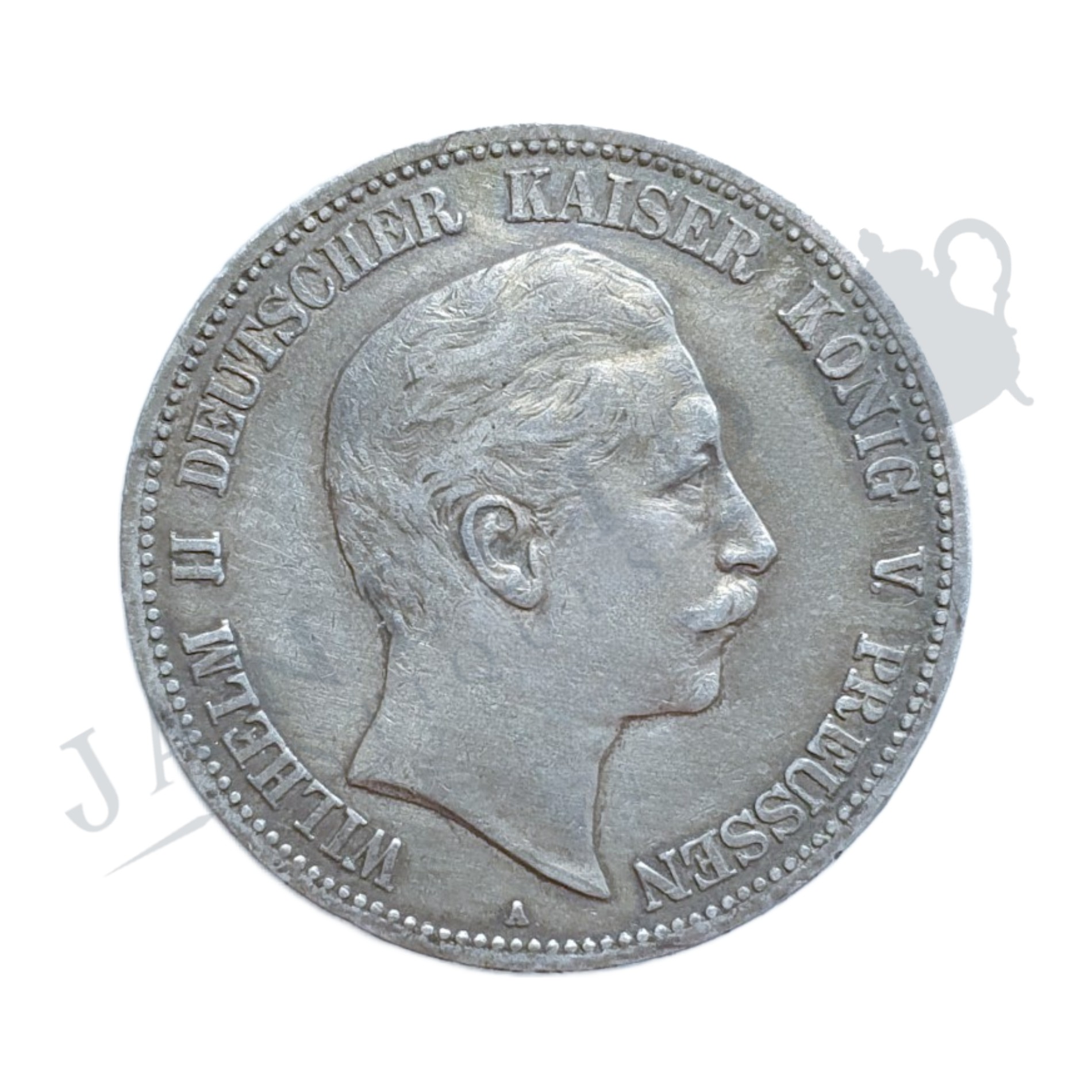 Die detailreiche Darstellung des Kaisers mit markantem Schnurrbart und feinen Gesichtszügen macht diese Münze zu einem eindrucksvollen Zeitzeugnis der Vorkriegszeit. Die Wertseite trägt den Nennwert „5 Mark“ sowie den Reichsadler, ein Symbol für Macht, Einheit und Souveränität des Kaiserreichs.