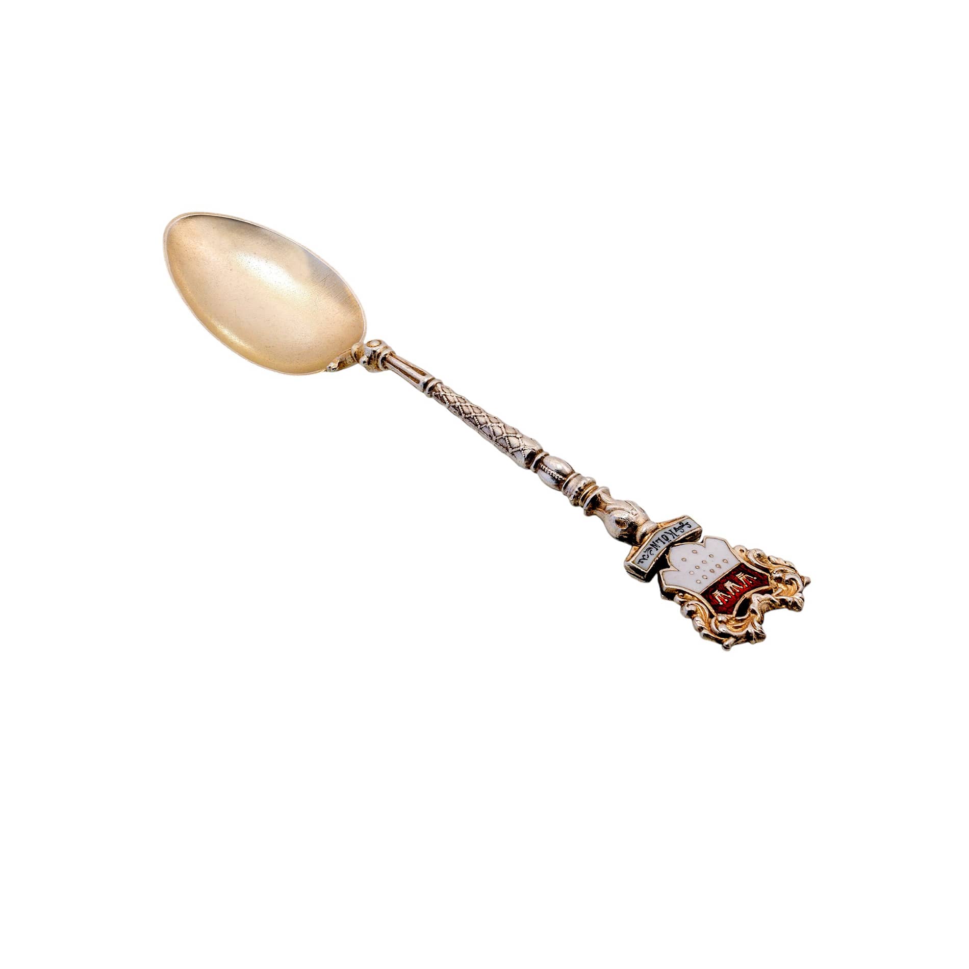 Sammellöffel Köln, sehr hohe qualitative Arbeit, Laffe mattiert gefertigt, Stiel mit feinem Rautenmuster, Wappen mit rot/weißem Emaille, weißes Emaille-Band mit Schriftzug Köln