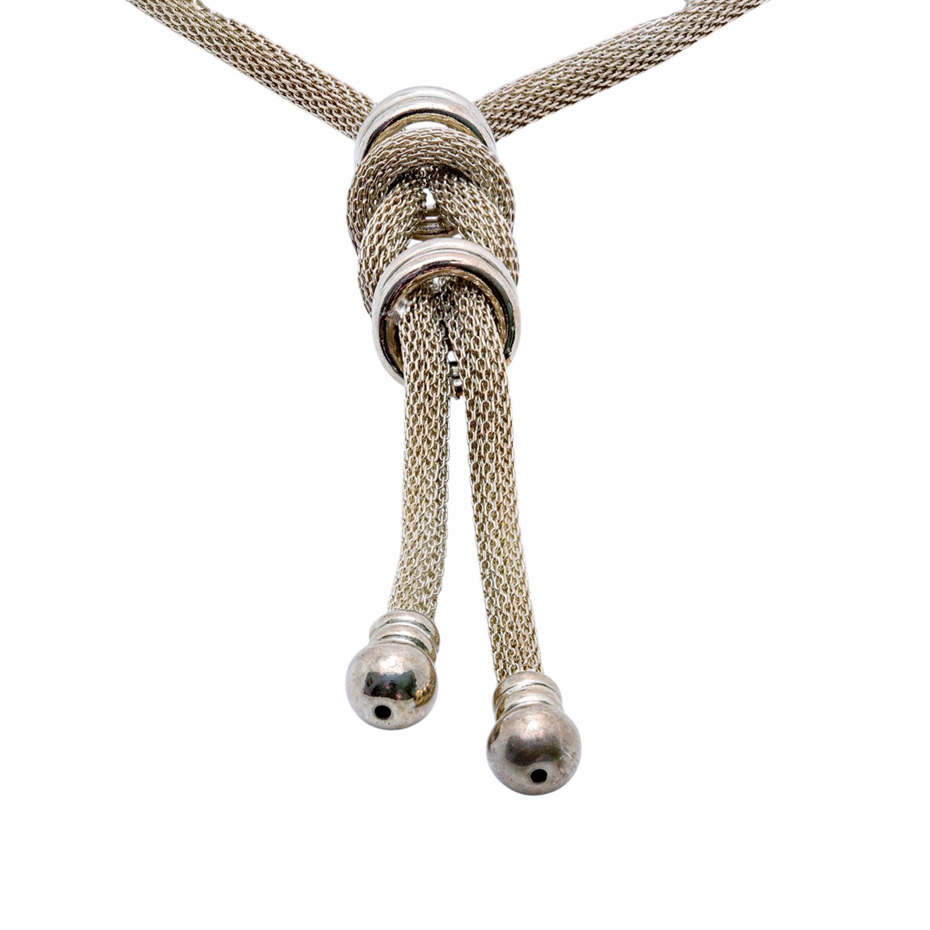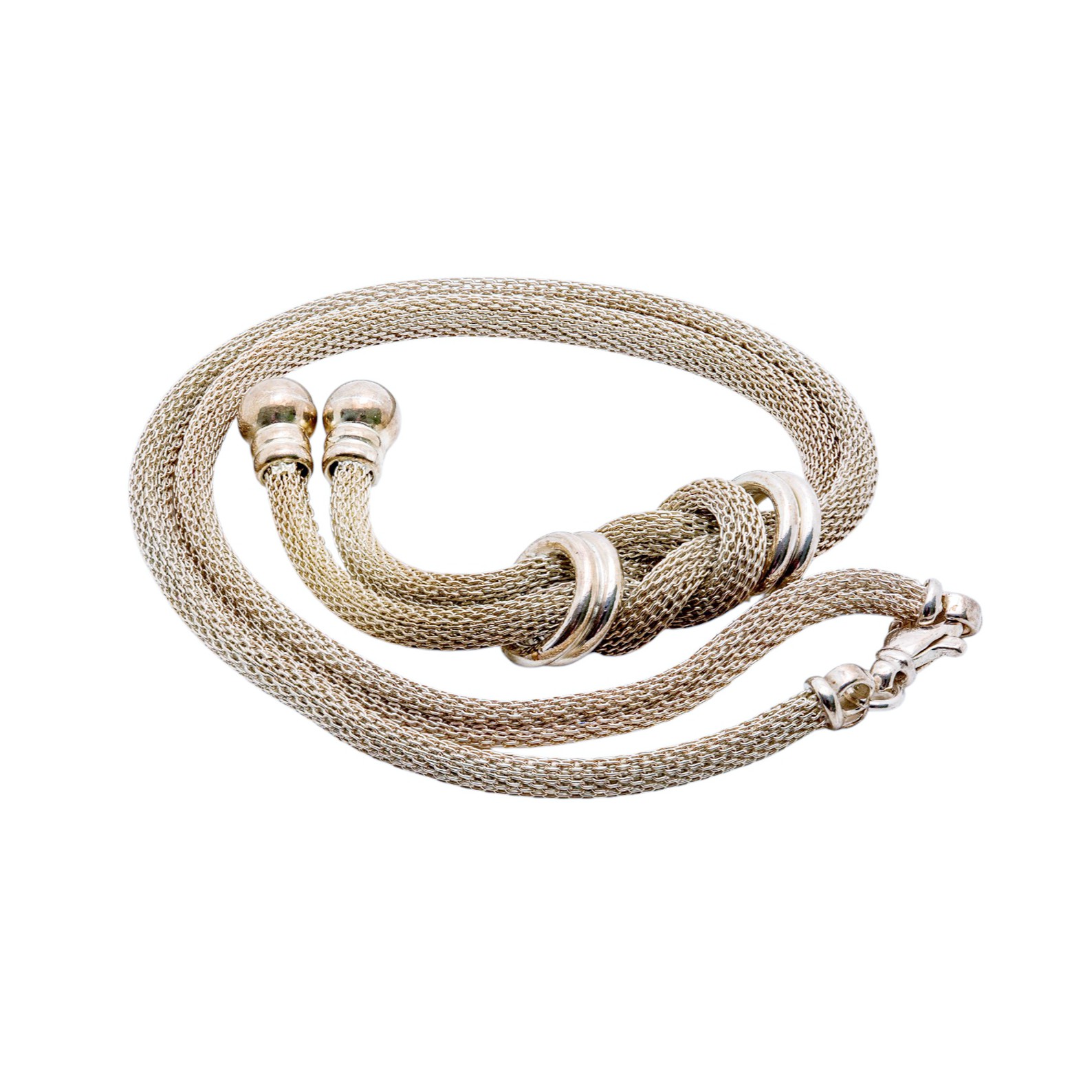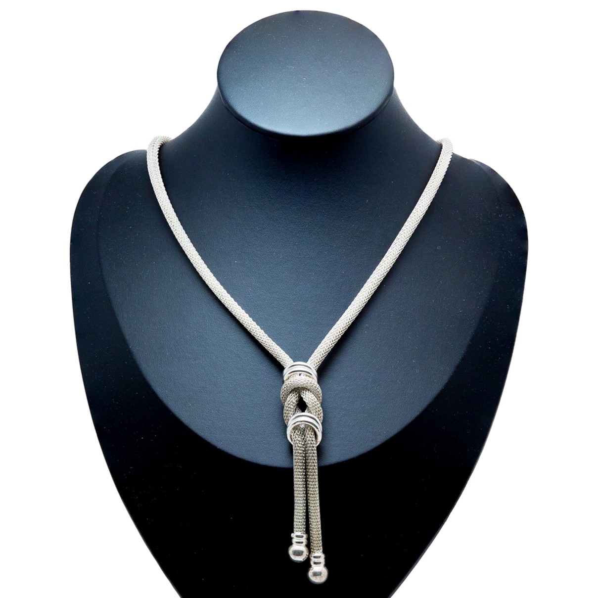 Die glänzenden Silberringe, die den Knoten fixieren, setzen moderne Akzente und unterstreichen die besondere Formgebung. Die beiden längeren Endstücke der Kette fallen sanft nach unten und sind mit stilvollen Silberkugeln abgeschlossen, die dem Design eine harmonische Balance geben. Dank des robusten Verschlusses lässt sich die Kette sicher tragen und vielseitig kombinieren – ob zu eleganter Kleidung, modernen Outfits oder als auffälliges Highlight im Alltag.