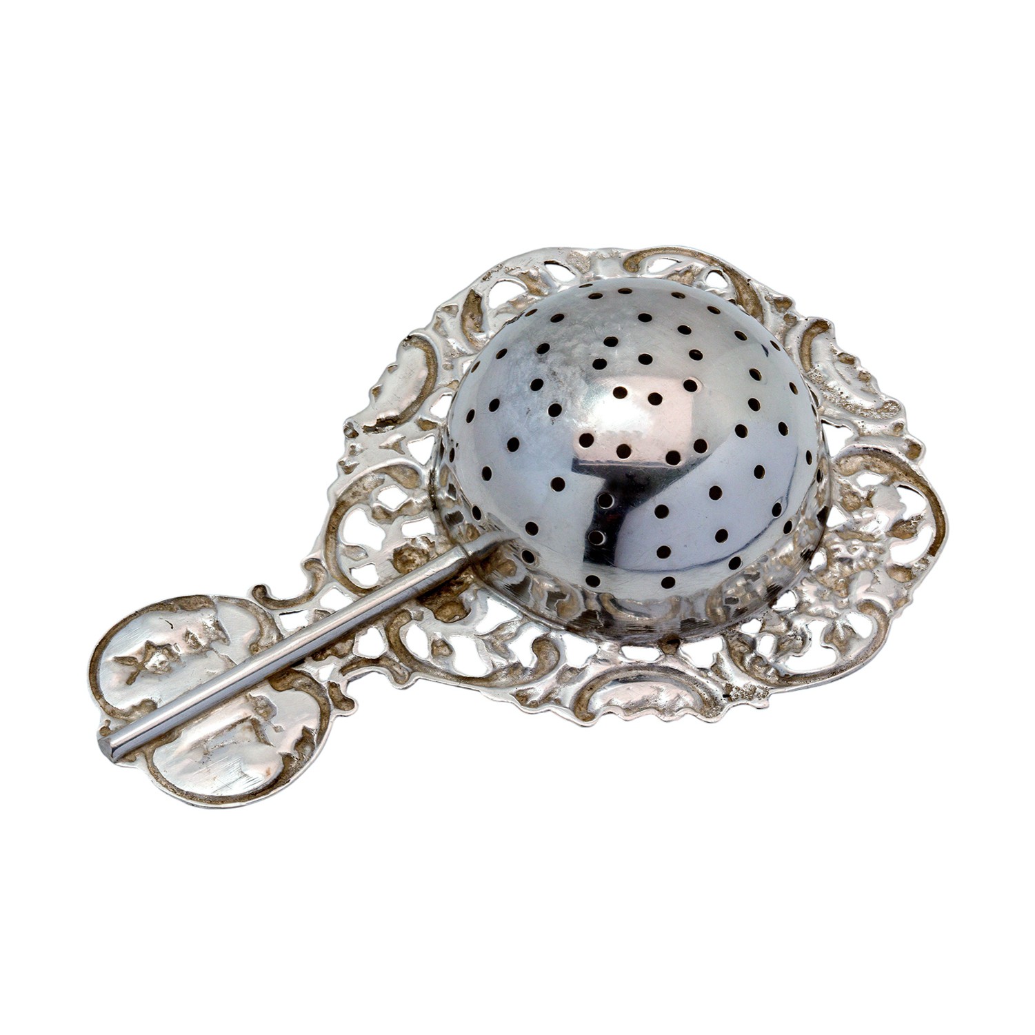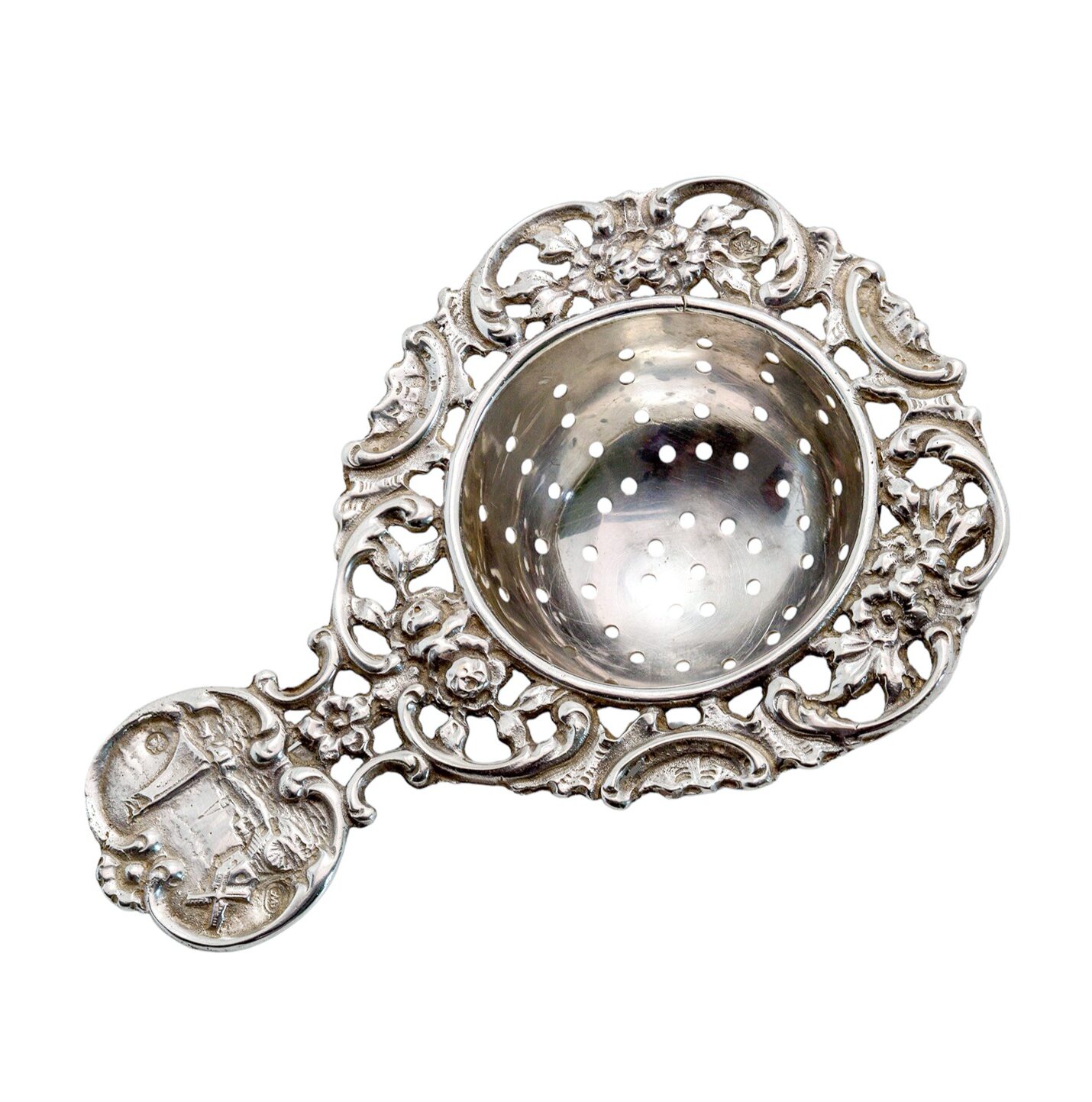 Elegantes antikes Teesieb aus fein gearbeitetem Silber mit reichem Rokoko-Dekor. Das Stück stammt aus den Niederlanden und überzeugt durch seine detailreiche, durchbrochene Gestaltung. Florale Ornamente umrahmen die halbkugelige Siebschale und verleihen dem Objekt eine besonders dekorative Wirkung.