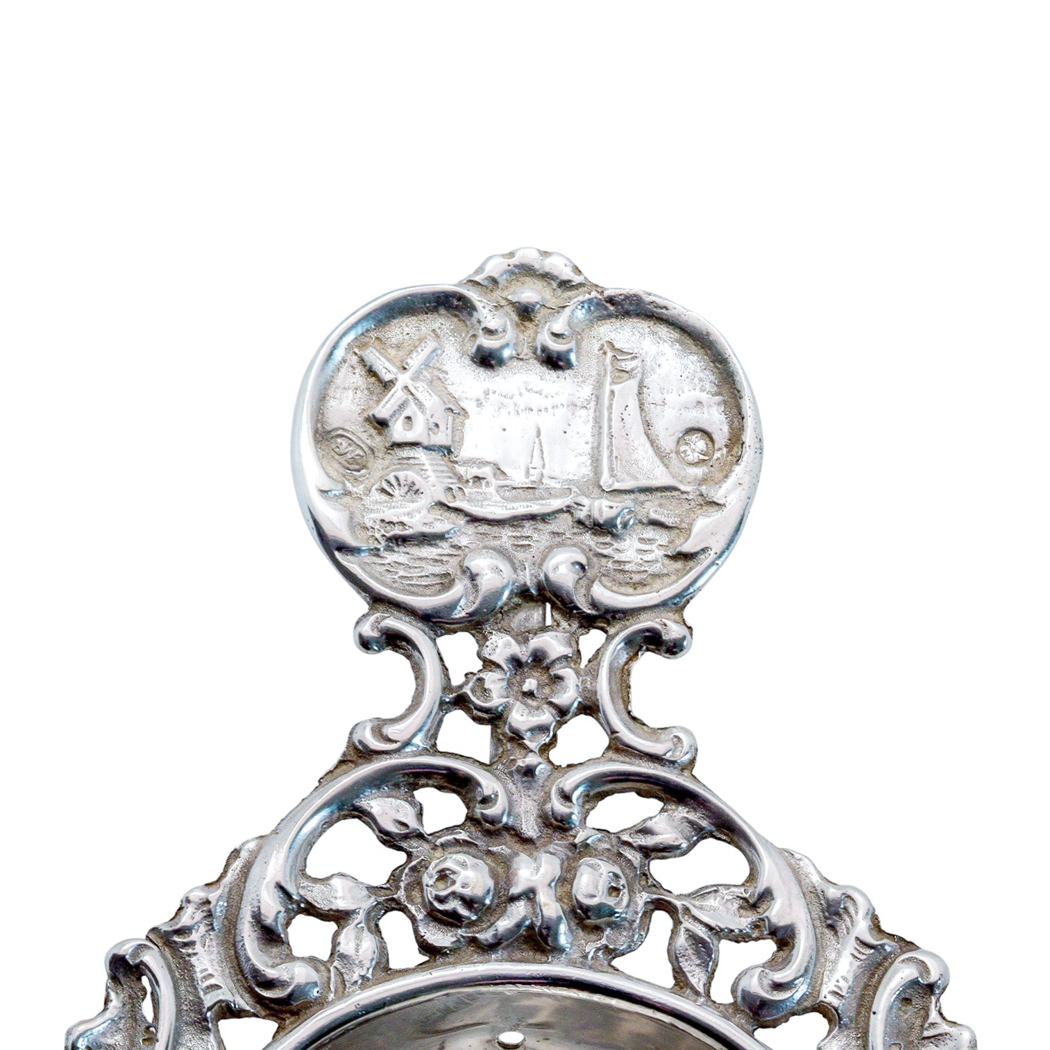 Der Griff endet in einer plastisch ausgeformten Platte mit maritimer Szene, die ein Segelschiff, eine Windmühle und eine Küstenlandschaft zeigt und damit einen charmanten Bezug zur niederländischen Tradition herstellt. Die gleichmäßig gelochte Siebschale ist funktional gestaltet und eignet sich ideal zum Aufbrühen von losem Tee.