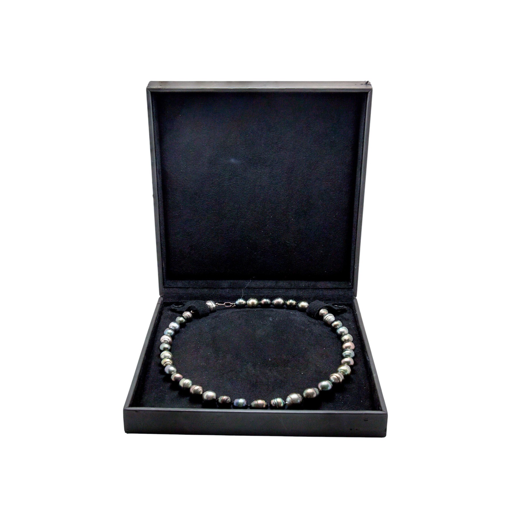 Diese edle Tahitiperlenkette fasziniert durch ihre beeindruckende Vielfalt an natürlichen Farbnuancen, wie sie ausschließlich echte Tahitiperlen hervorbringen. Die Perlen zeigen ein ausdrucksstarkes Spektrum, das von dunklen Silber- und Grautönen über tiefes Metallic-Blau bis hin zu sattem Schwarz reicht.