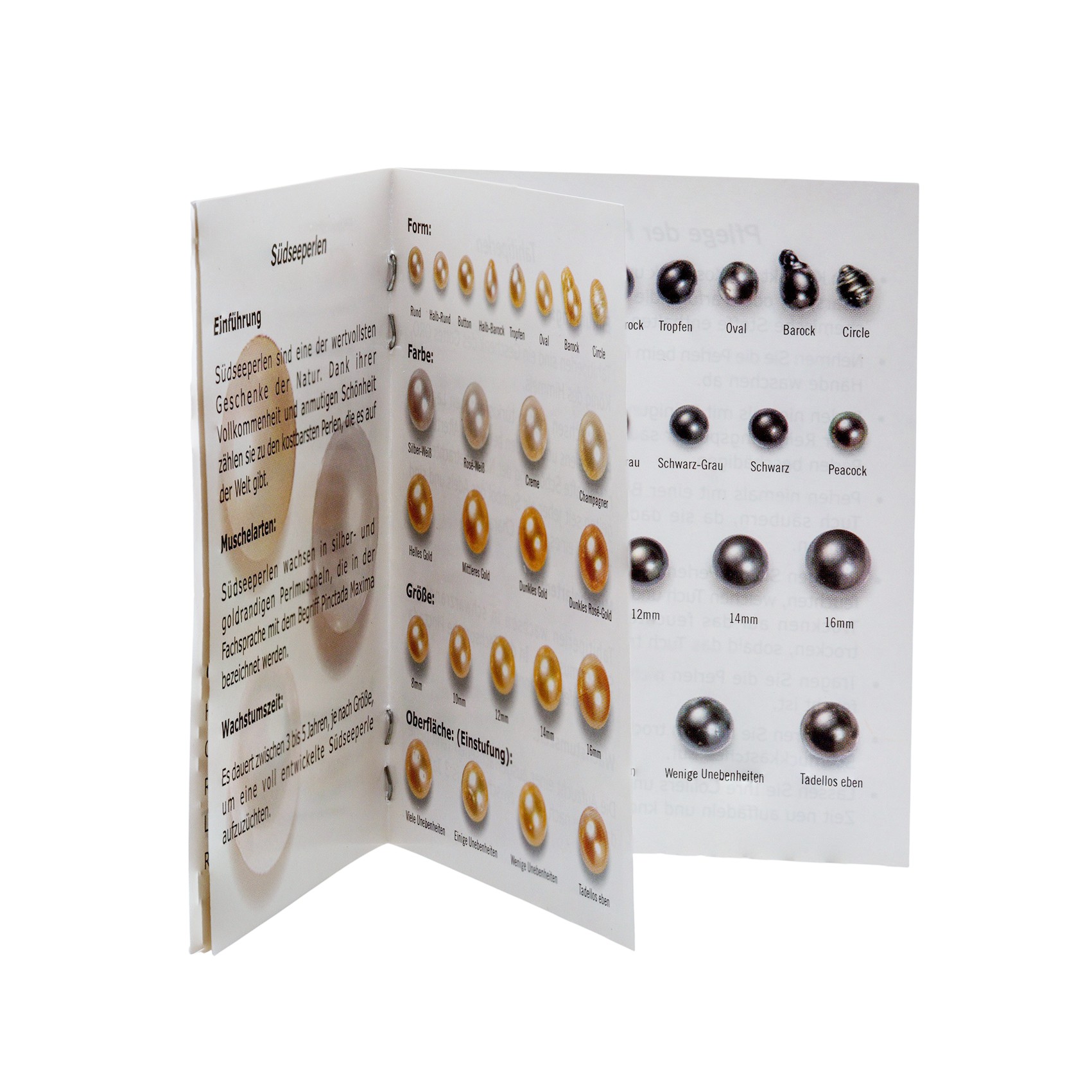 Für eine stilvolle Präsentation und sichere Aufbewahrung wird sie in einem hochwertigen schwarzen Samtetui geliefert. Zusätzlich liegt ein informatives Booklet bei, das interessante Details über Südsee- und Tahitiperlen, ihre Entstehung, Qualitätsmerkmale und Farbkategorien vermittelt.