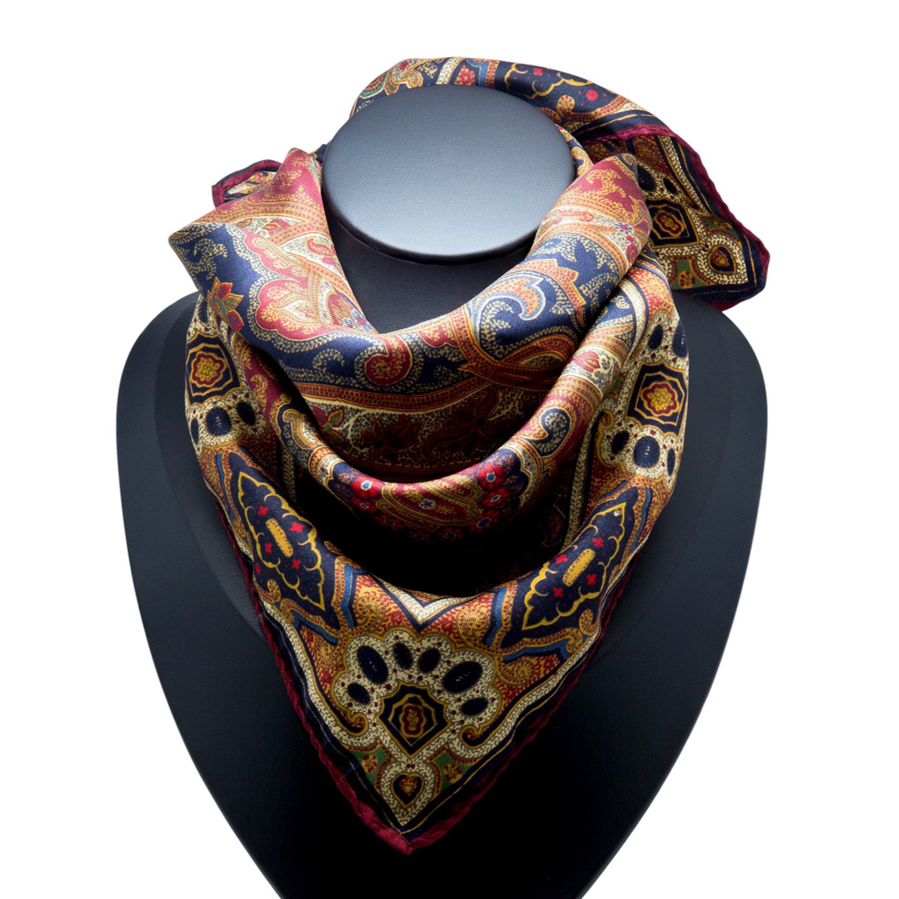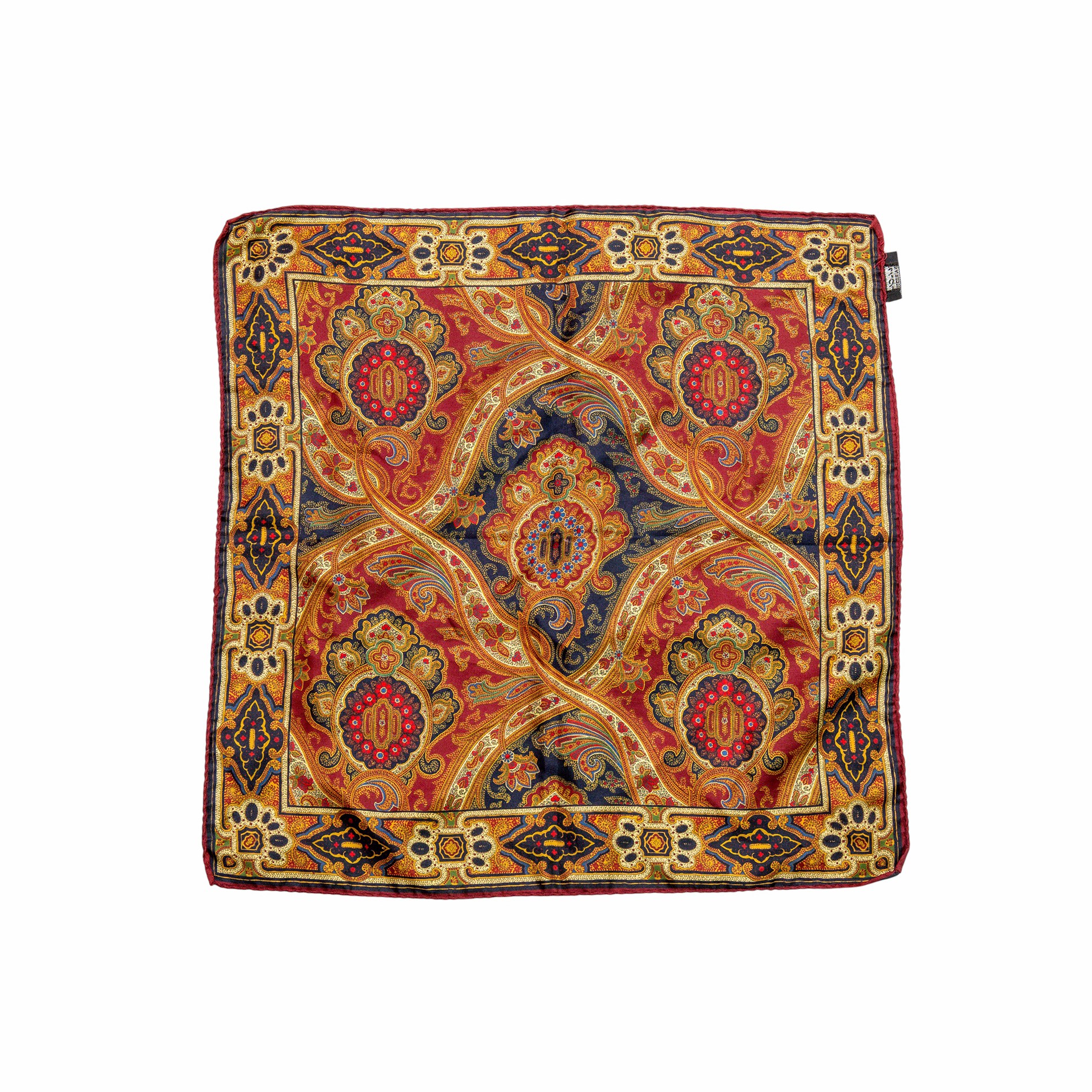 Das aufwendig gestaltete Ornamentmuster vereint warme Bordeaux-, Gold- und Schwarztöne mit feinen floralen und paisleyartigen Elementen zu einer harmonischen, zeitlosen Komposition. Der dekorative Rahmen verleiht dem Tuch Struktur und unterstreicht seine hochwertige Ausarbeitung.