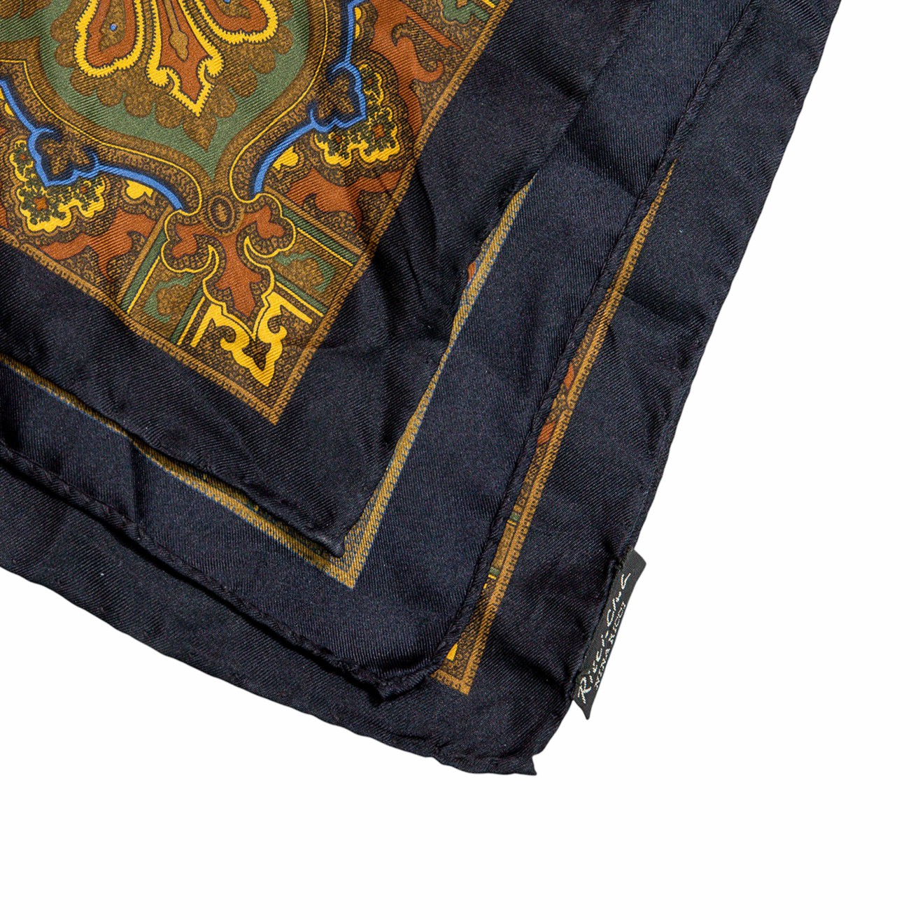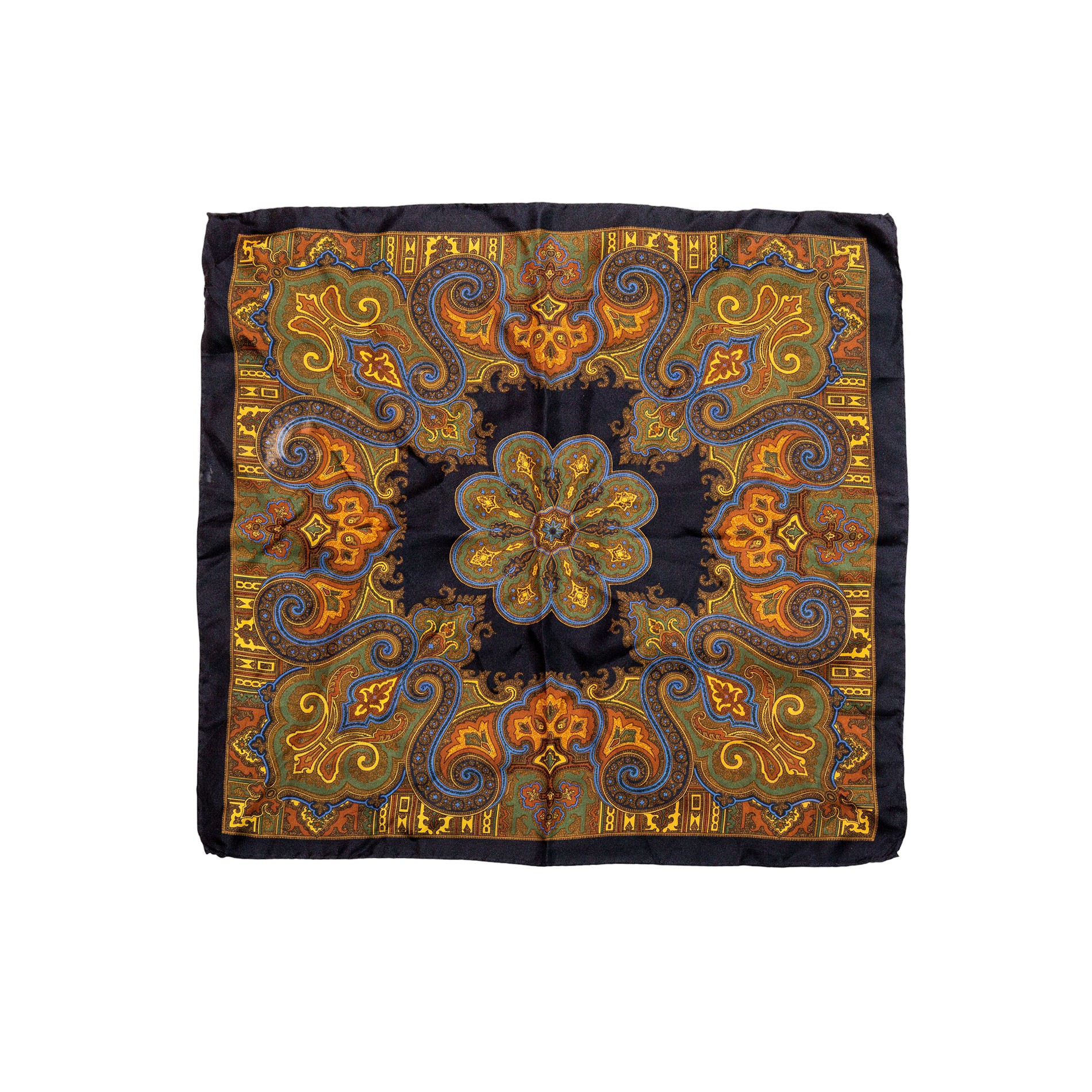 Dieses exquisite Seidentuch von Nina Ricci verkörpert zeitlose Eleganz und französische Raffinesse. Gefertigt aus feinster, reiner Seide, begeistert es mit einem luxuriösen, weichen Griff und einem dezenten, edlen Glanz. Das kunstvolle Paisley-Ornament in harmonischen Blau-, Grün- und Goldtönen entfaltet sich auf einem tiefdunklen Fond und verleiht dem Tuch eine klassische, zugleich ausdrucksstarke Ausstrahlung.