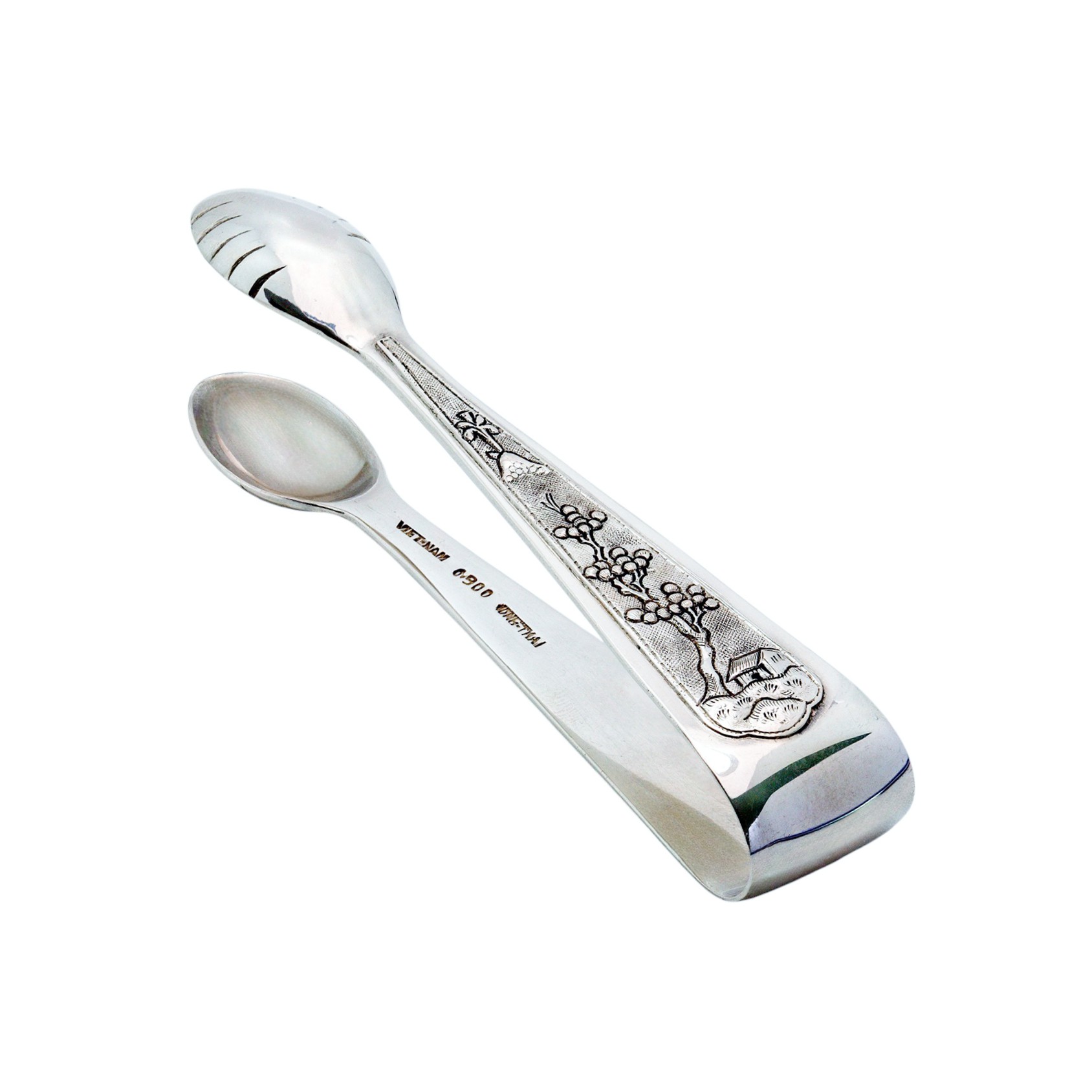 Fein verzierte Zuckerzange aus 900er Silber aus Vietnam – ein elegantes Accessoire für die stilvolle Tee- oder Kaffeetafel und zugleich ein charmantes Sammlerstück mit fernöstlichem Charakter. Dieses besondere Stück verbindet praktische Funktion mit kunstvoller Gestaltung und zeigt die traditionelle Handwerkskunst vietnamesischer Silberschmiede.