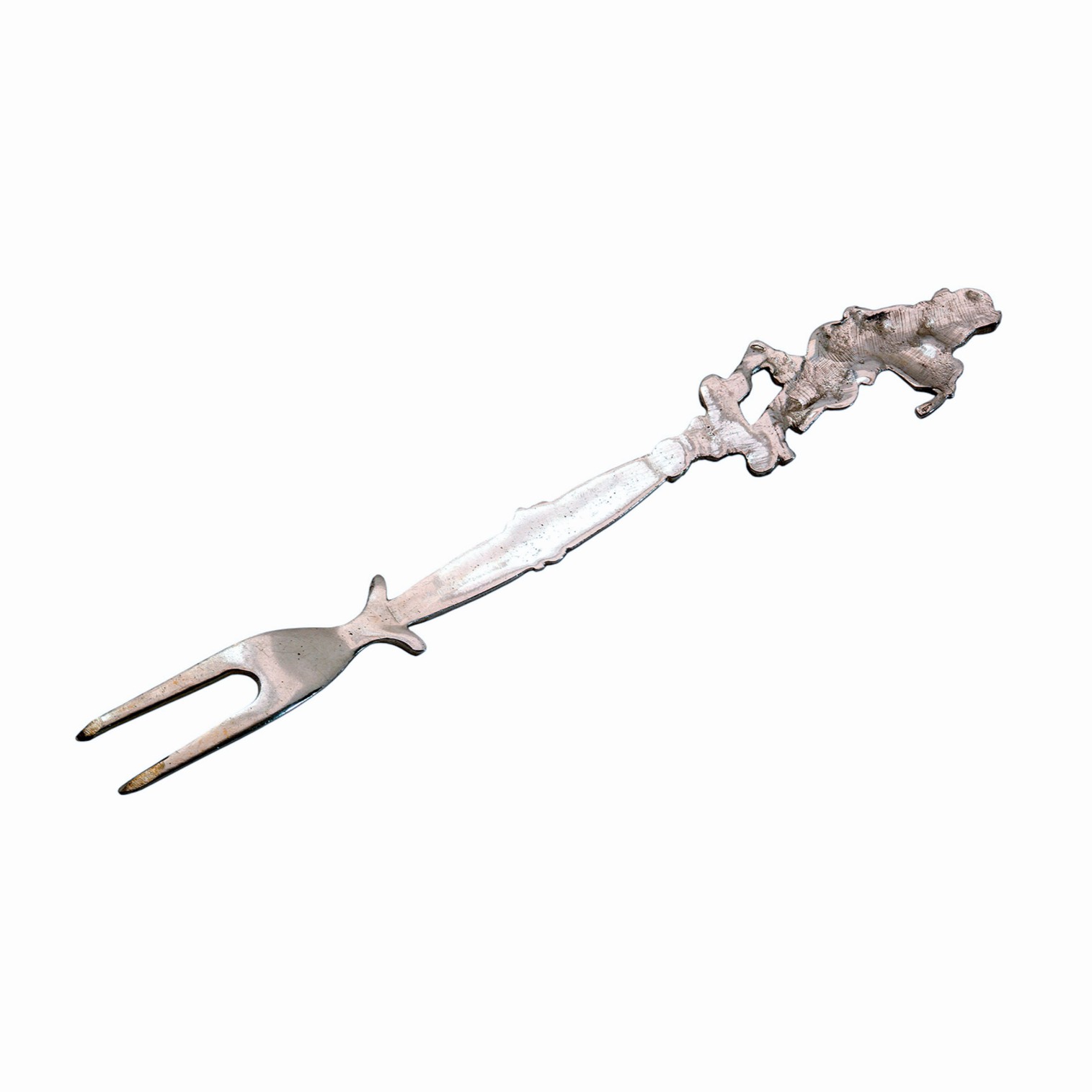 Solche figürlichen Darstellungen sind typisch für den Historismus und waren um die Wende vom 19. zum 20. Jahrhundert besonders beliebt. Der Schaft ist mit floralen Ornamenten verziert und geht harmonisch in die zweizinkige Gabel über.