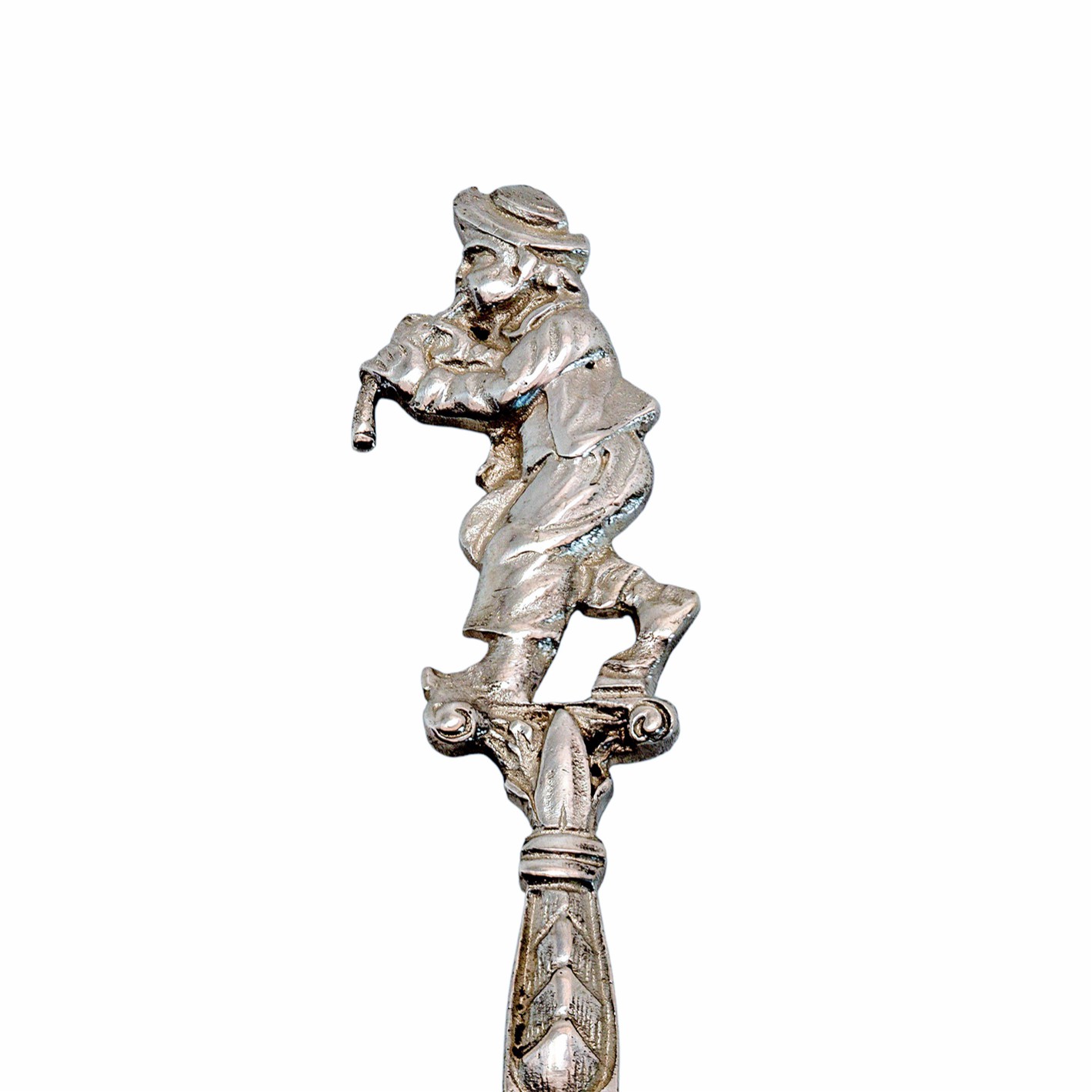 Diese außergewöhnliche Aufschnitt- bzw. Vorlegegabel ist aus massivem 800er Silber gefertigt und besticht durch ihre detailreiche, figürliche Gestaltung. Der Griff wird von einer plastisch ausgearbeiteten Figur eines Musikanten bekrönt, der mit Pfeife dargestellt ist – ein ausdrucksstarkes Motiv, das dem Stück einen besonderen dekorativen Charakter verleiht.