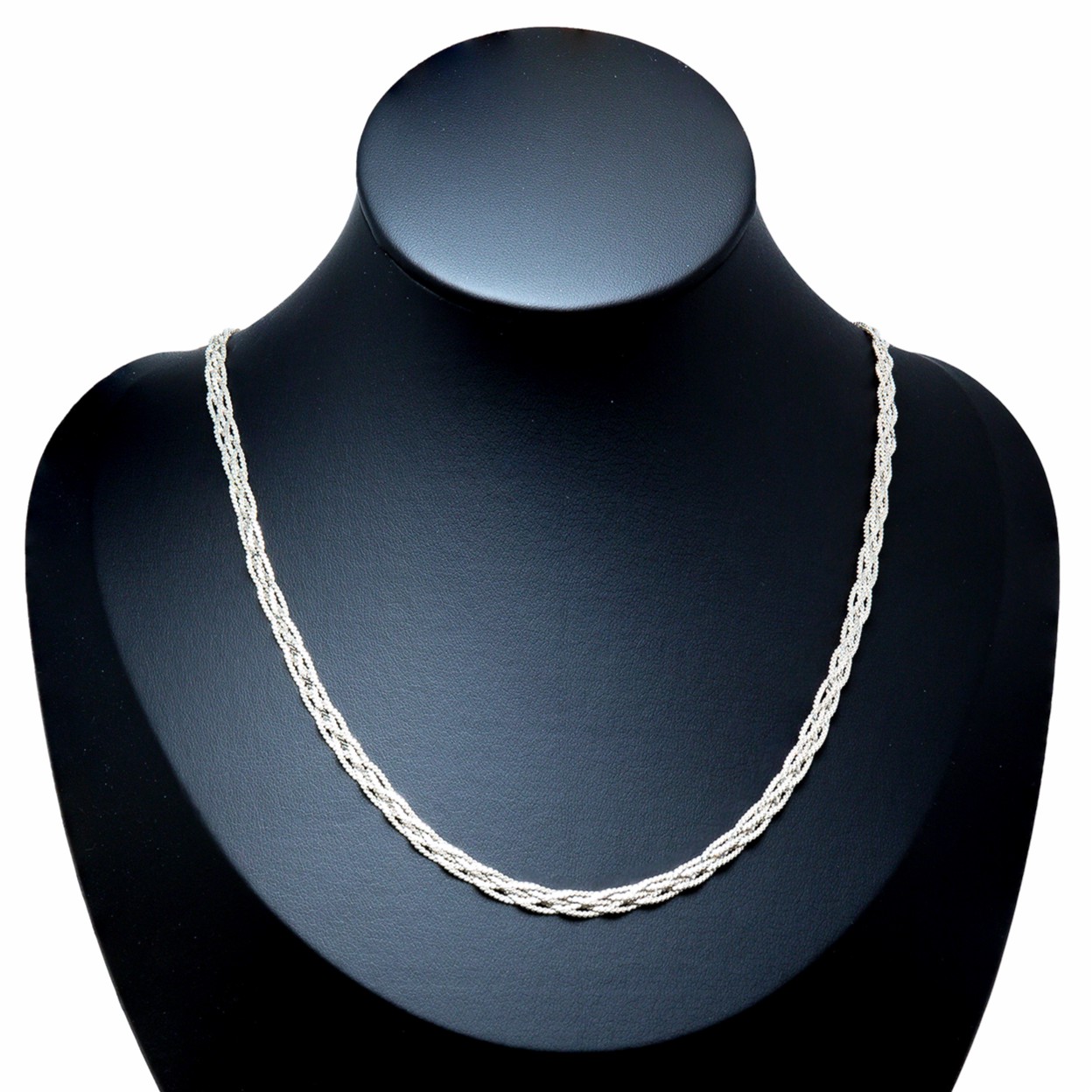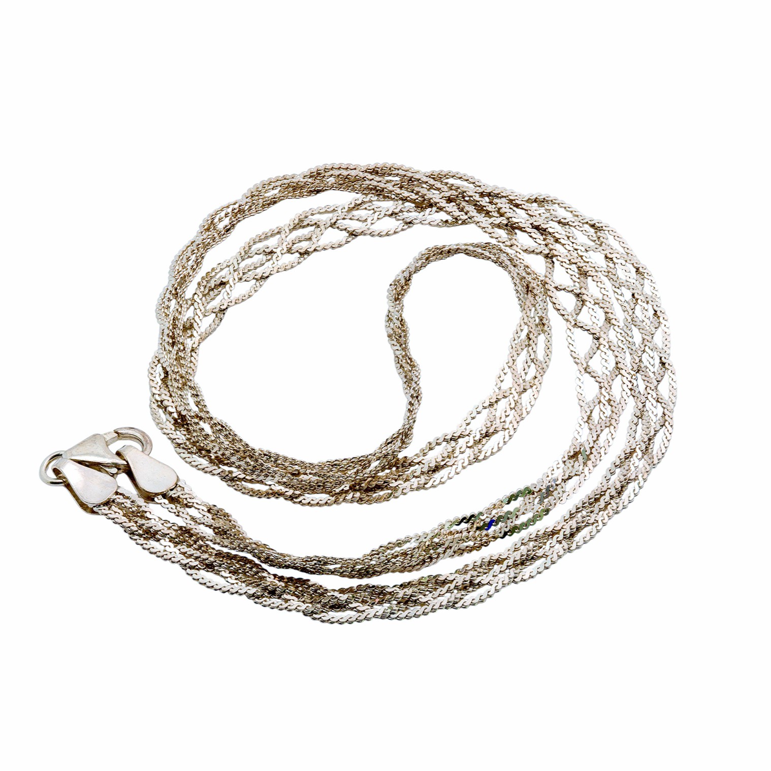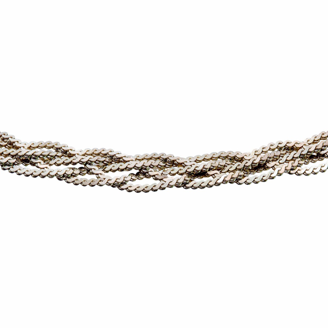 Diese elegante Halskette aus 925er Sterlingsilber beeindruckt durch ihr raffiniertes, mehrreihiges Design und ihren außergewöhnlich feinen Glanz. Die einzelnen Stränge sind kunstvoll ineinander verwoben und erzeugen eine leicht funkelnde Struktur, die das Licht bei jeder Bewegung stilvoll reflektiert.