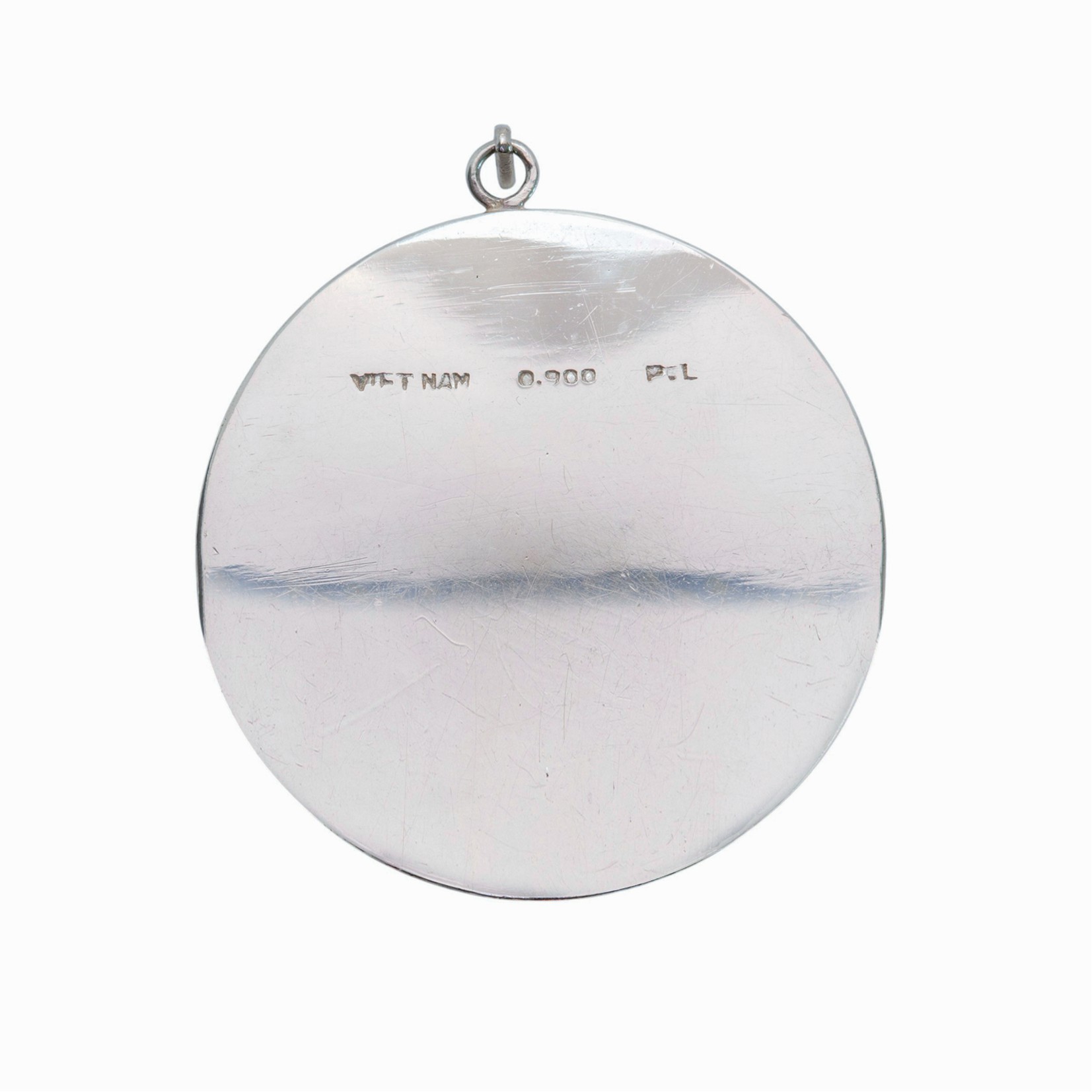 Durch das offene Relief entsteht eine schöne Tiefenwirkung, die das Licht wirkungsvoll reflektiert und die filigranen Details hervorhebt. Die Rückseite ist glatt gearbeitet und mit der Punze „VIET NAM 0.900“ versehen, was den Silbergehalt bestätigt.