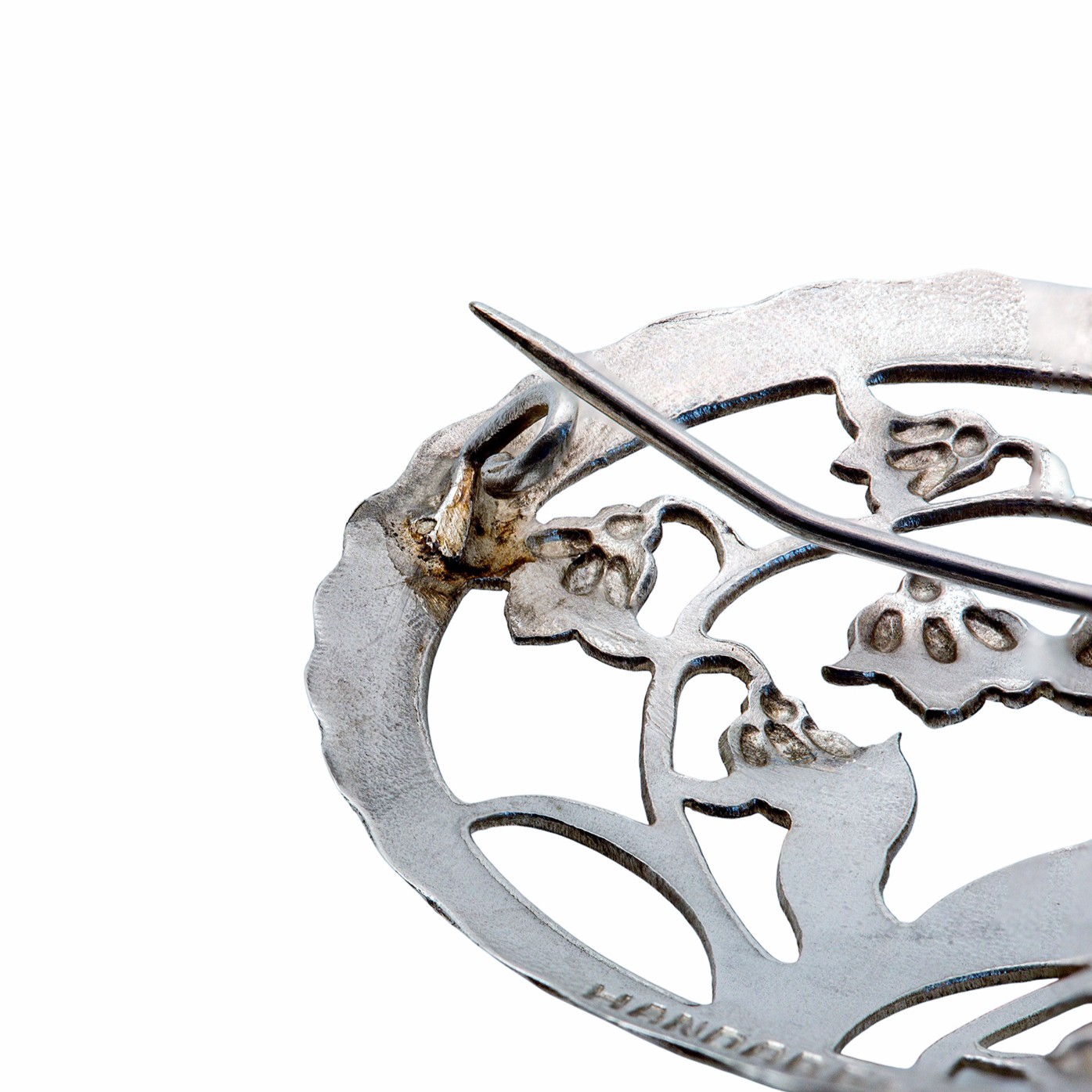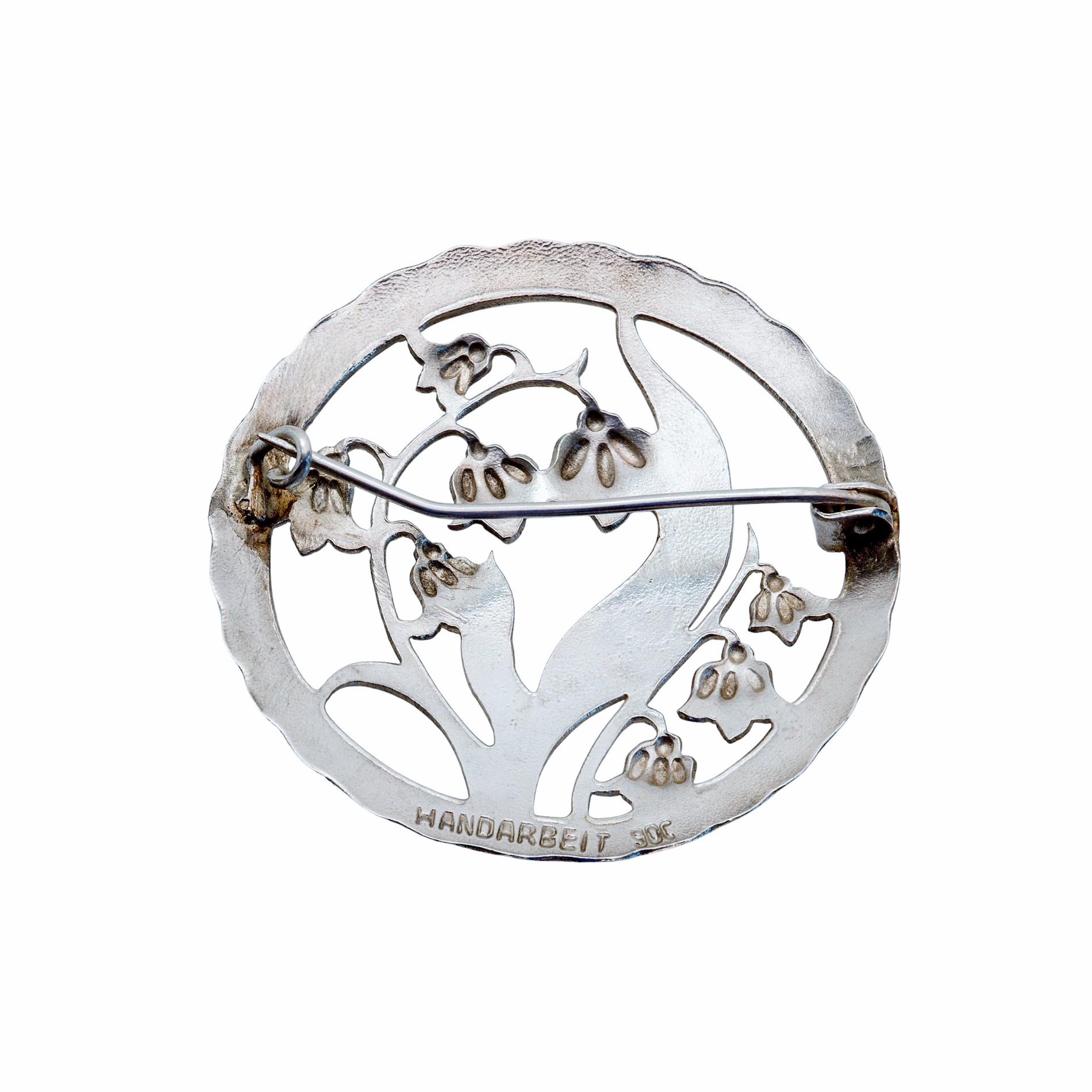 Jede Linie wirkt bewusst gesetzt, jede Rundung sorgfältig ausgearbeitet – ein deutlicher Hinweis auf meisterhafte Handarbeit. Der rundgefasste Rahmen mit seiner sanft strukturierten Oberfläche verleiht dem Schmuckstück zusätzlichen Charakter. Auf der Rückseite befindet sich die Punze „Handarbeit 900“, die sowohl die hohe Silberqualität als auch den handwerklichen Ursprung bestätigt.