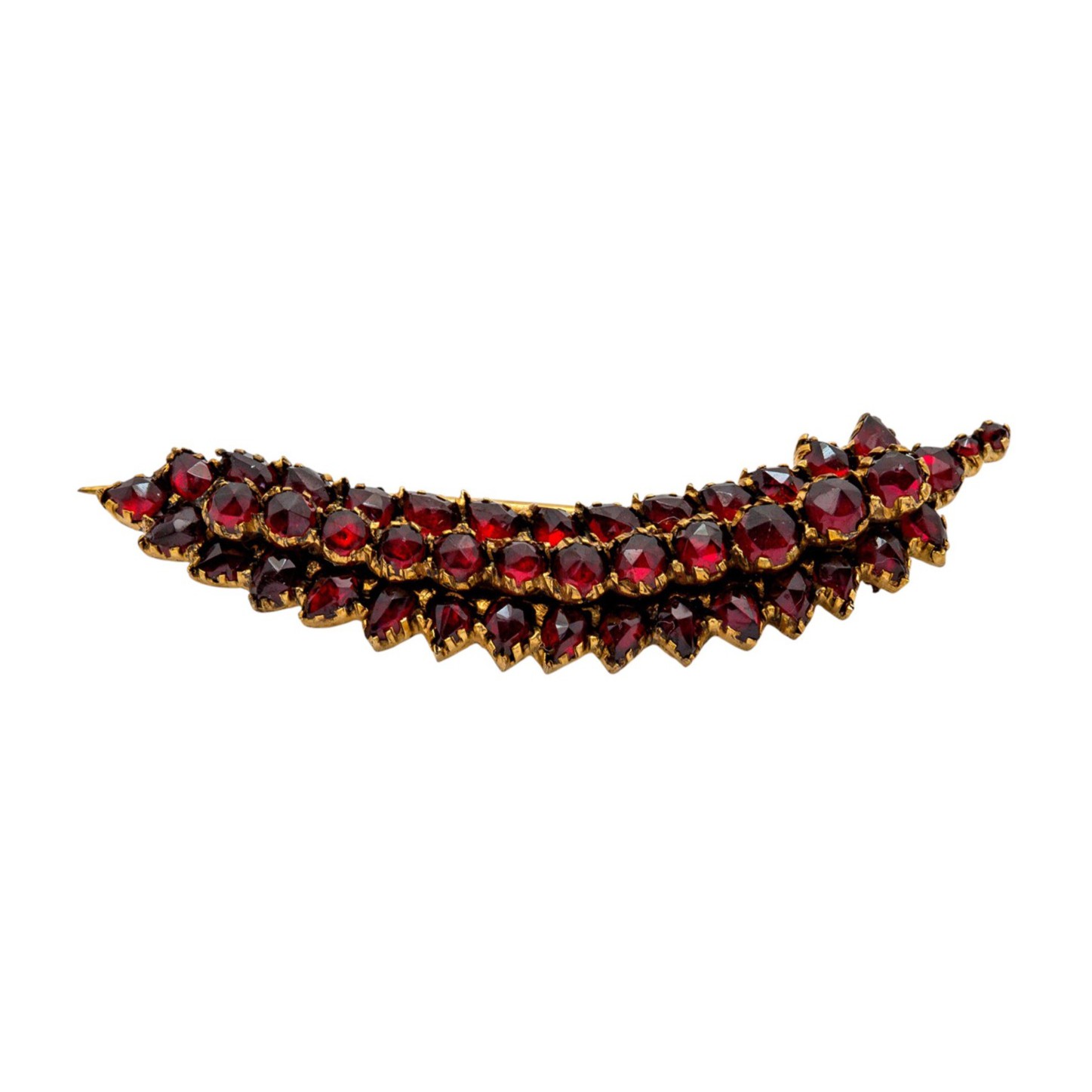 Diese elegante Brosche vereint klassische Handwerkskunst mit der faszinierenden Ausstrahlung echter Granate. Zahlreiche tiefrote Granatsteine sind in sorgfältiger Fassarbeit gesetzt.
