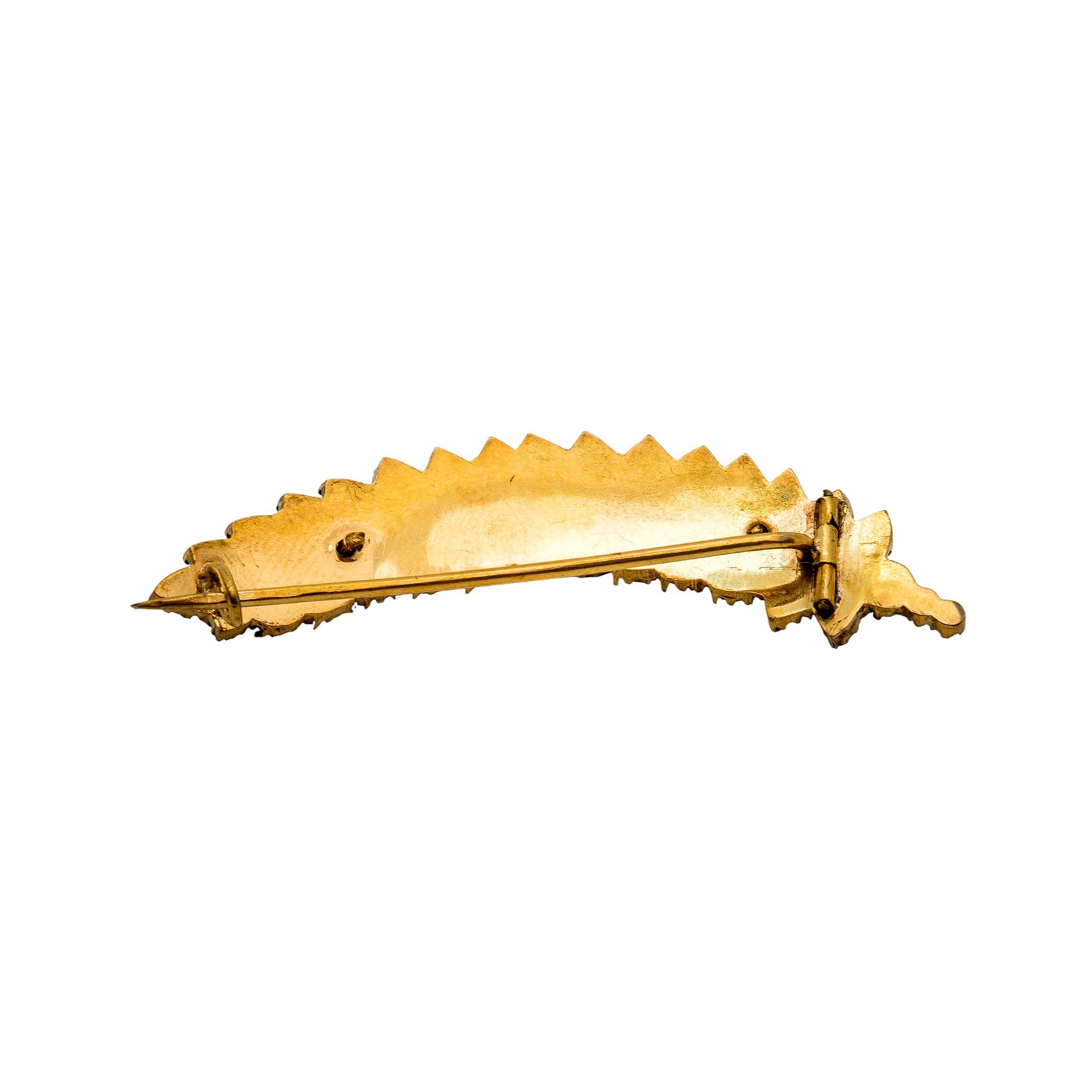Die reichen, weinroten Farbnuancen der Granate harmonieren perfekt mit der warmen Vergoldung des Metalls und lassen die Brosche kraftvoll und zugleich stilvoll erscheinen. Die Rückseite zeigt eine traditionelle, stabile Nadelkonstruktion mit Hakenverschluss, wie sie bei feinem Vintage-Schmuck typisch ist.
