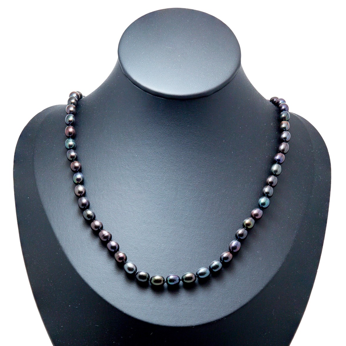 Diese elegante Halskette aus echten schwarzen Süßwasserzuchtperlen besticht durch ihr faszinierendes Farbspiel und ihre angenehm gleichmäßige Perlenform. Die sorgfältig ausgewählten, oval bis leicht tropfenförmig geformten Perlen zeigen je nach Lichteinfall tief schimmernde Farbnuancen, die von Blaugrün über Violett und Peacock bis hin zu warmen Schwarz- und Anthrazittönen reichen.