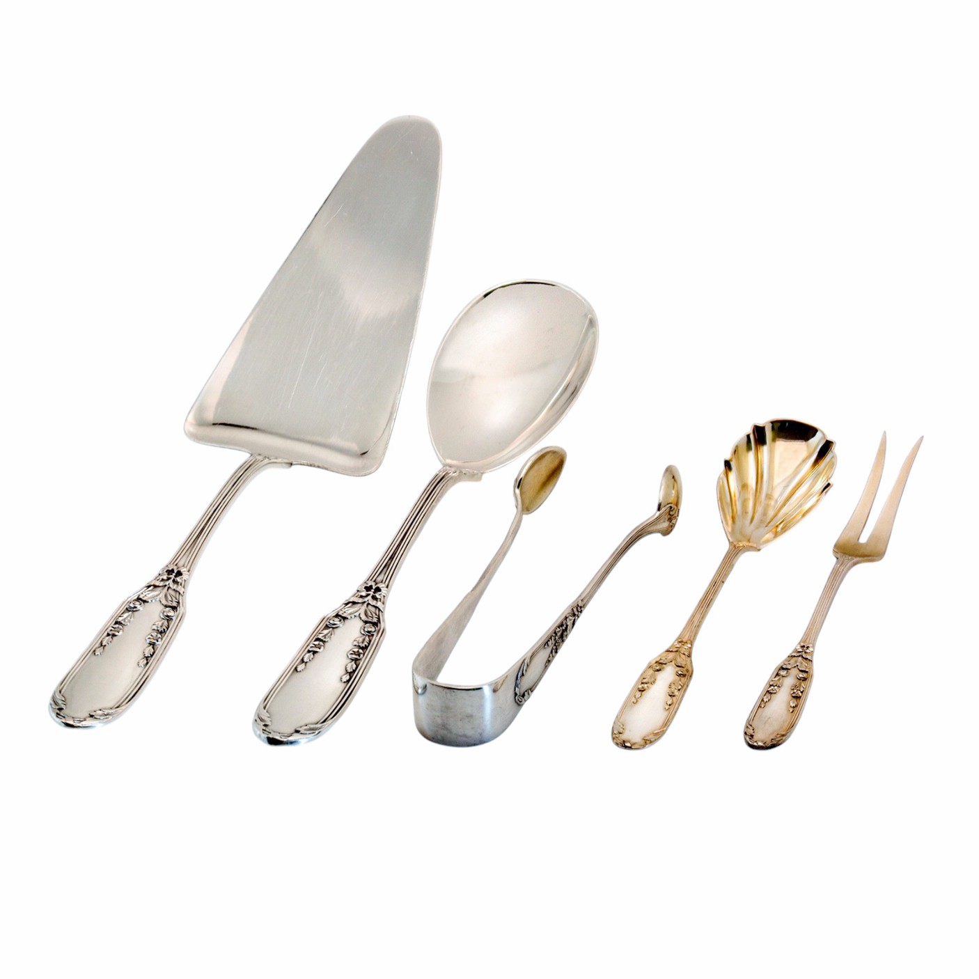 Klassisches 5-teiliges Vorlegebesteck aus 800er Silber von Karl Kaltenbach & Söhne aus Altensteig/Württemberg bietet zeitlose Eleganz für die stilvolle Tafel. Das Set umfasst einen Beilagenlöffel, eine Aufschnittgabel, einen Tortenheber, eine Zuckerzange sowie einen Zuckerlöffel und deckt damit die wichtigsten Servieraufgaben geschmackvoll ab. Übergangsstil Historismus / Jugendstil, um 1900.