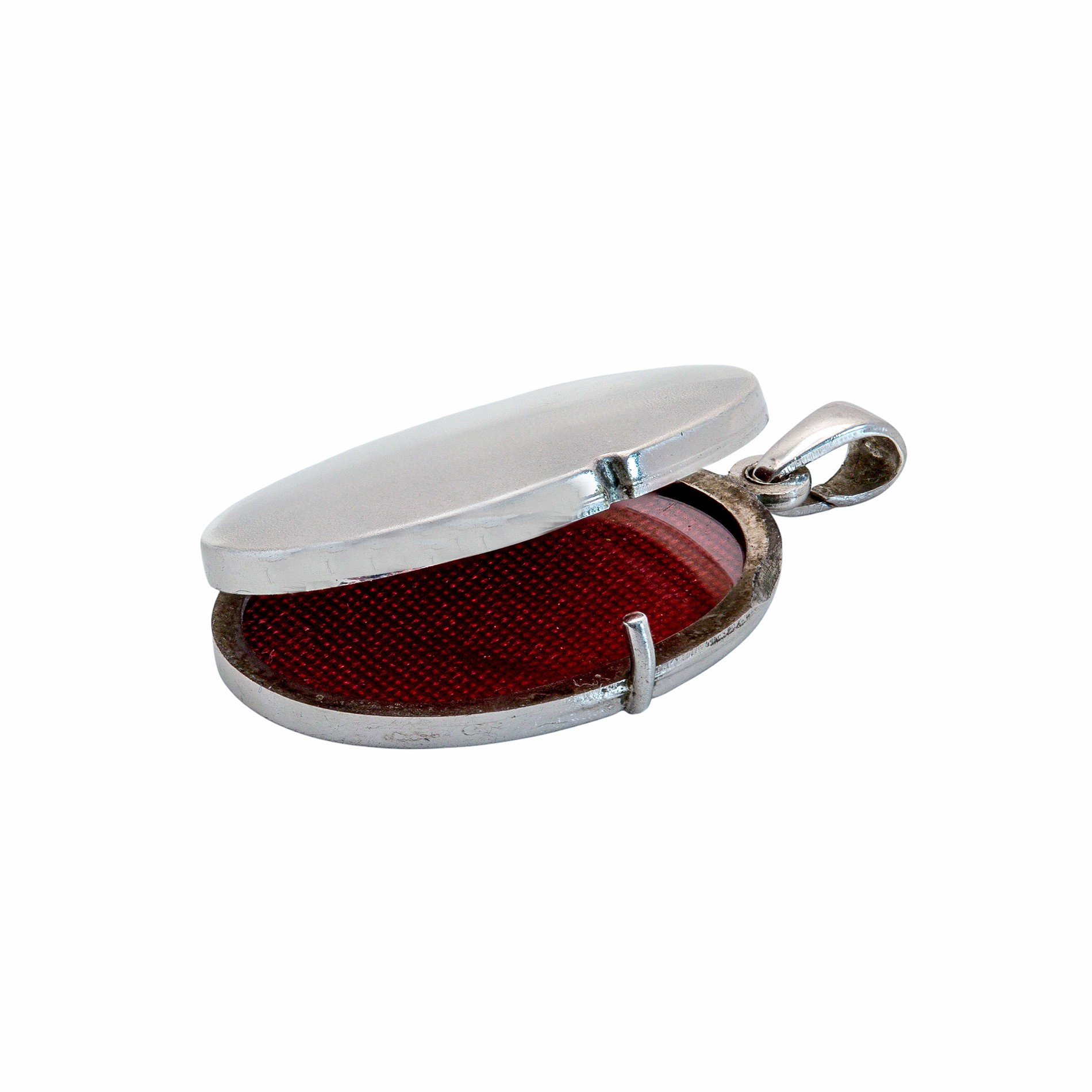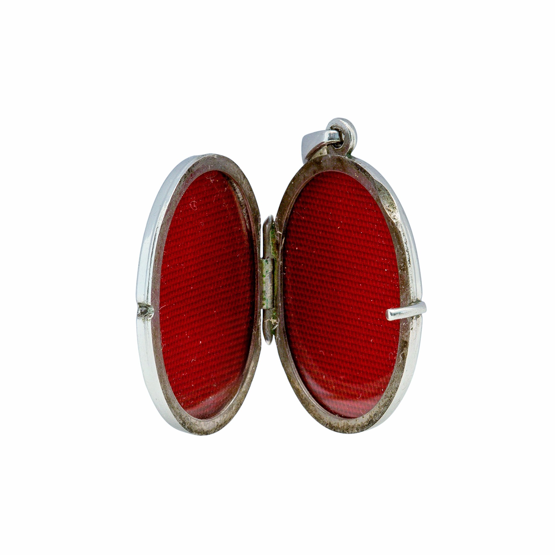 Das Medaillon lässt sich öffnen und bietet im Inneren Platz für zwei kleine Fotos, Haarsträhnen oder andere Erinnerungsstücke, die nah am Herzen getragen werden sollen. Ein rotes Samt- oder Stoffinlay schützt den Inhalt und unterstreicht den traditionellen Charakter dieses Schmuckstücks.