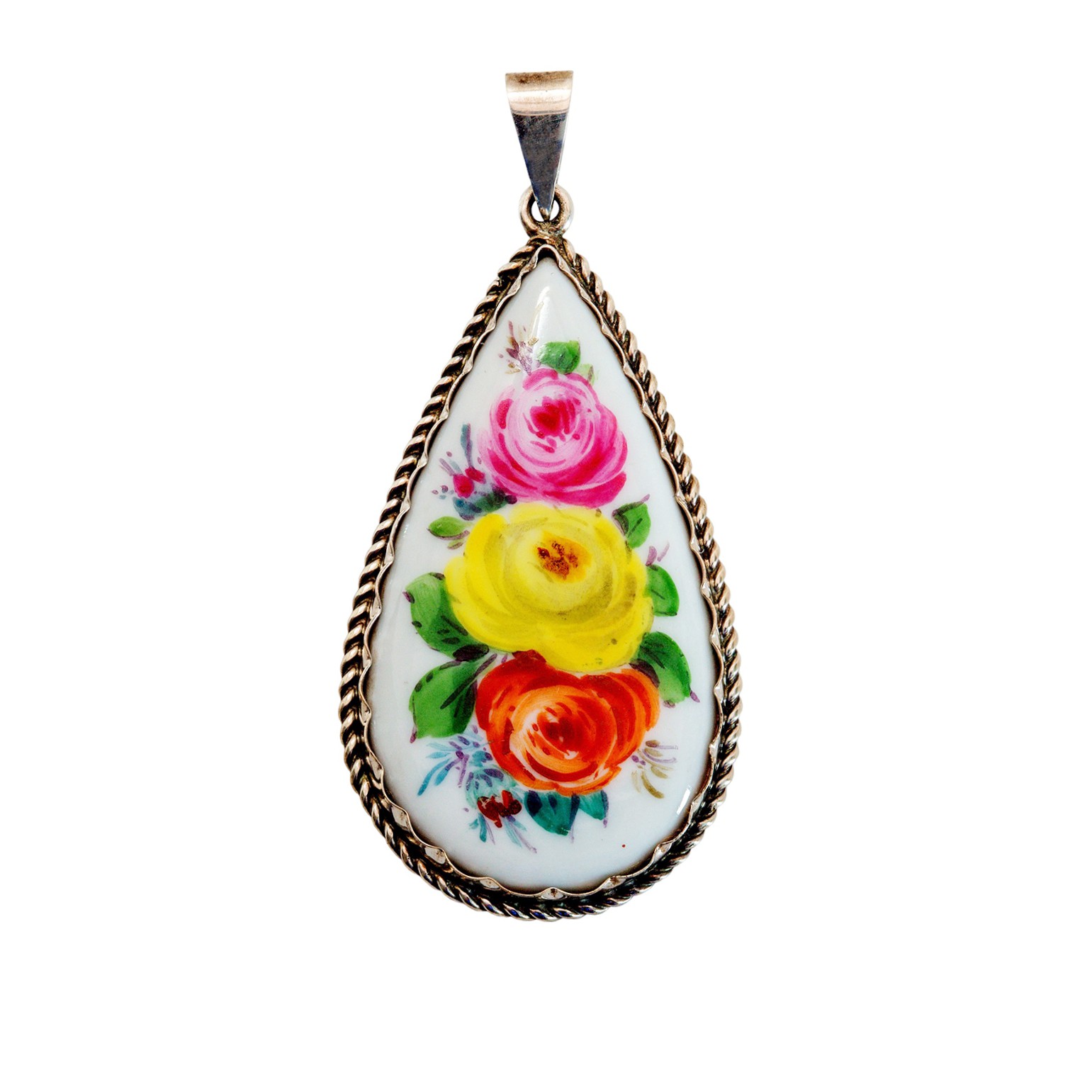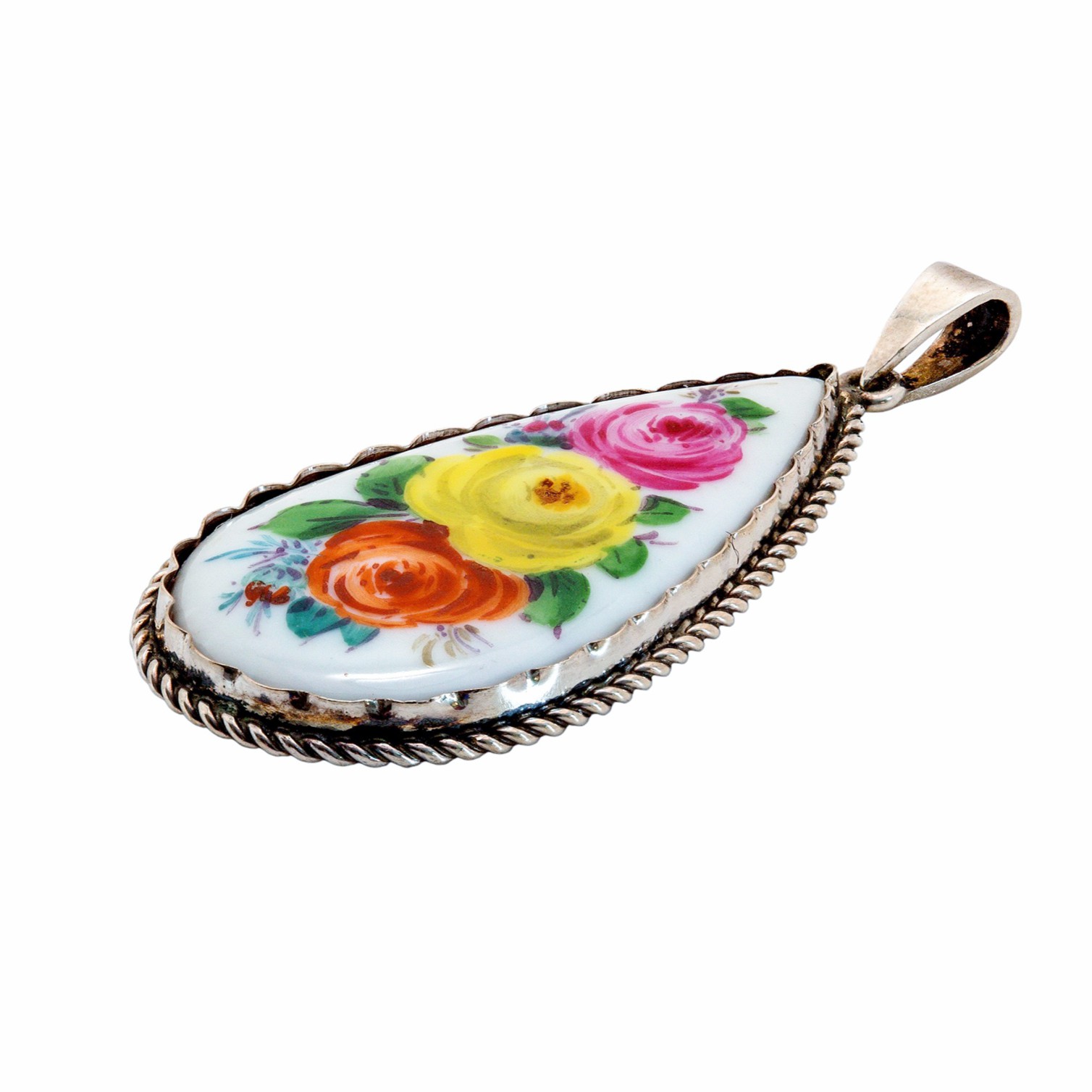 Dieser elegante Meissen Porzellan Anhänger vereint feine Porzellankunst mit hochwertiger Silberschmiedearbeit zu einem außergewöhnlichen Schmuckstück. Im Zentrum steht ein tropfenförmig gearbeitetes Porzellanmedaillon, kunstvoll von Hand bemalt mit einem farbenfrohen Blumenmotiv aus Rosen in Gelb, Rot und Pink.
