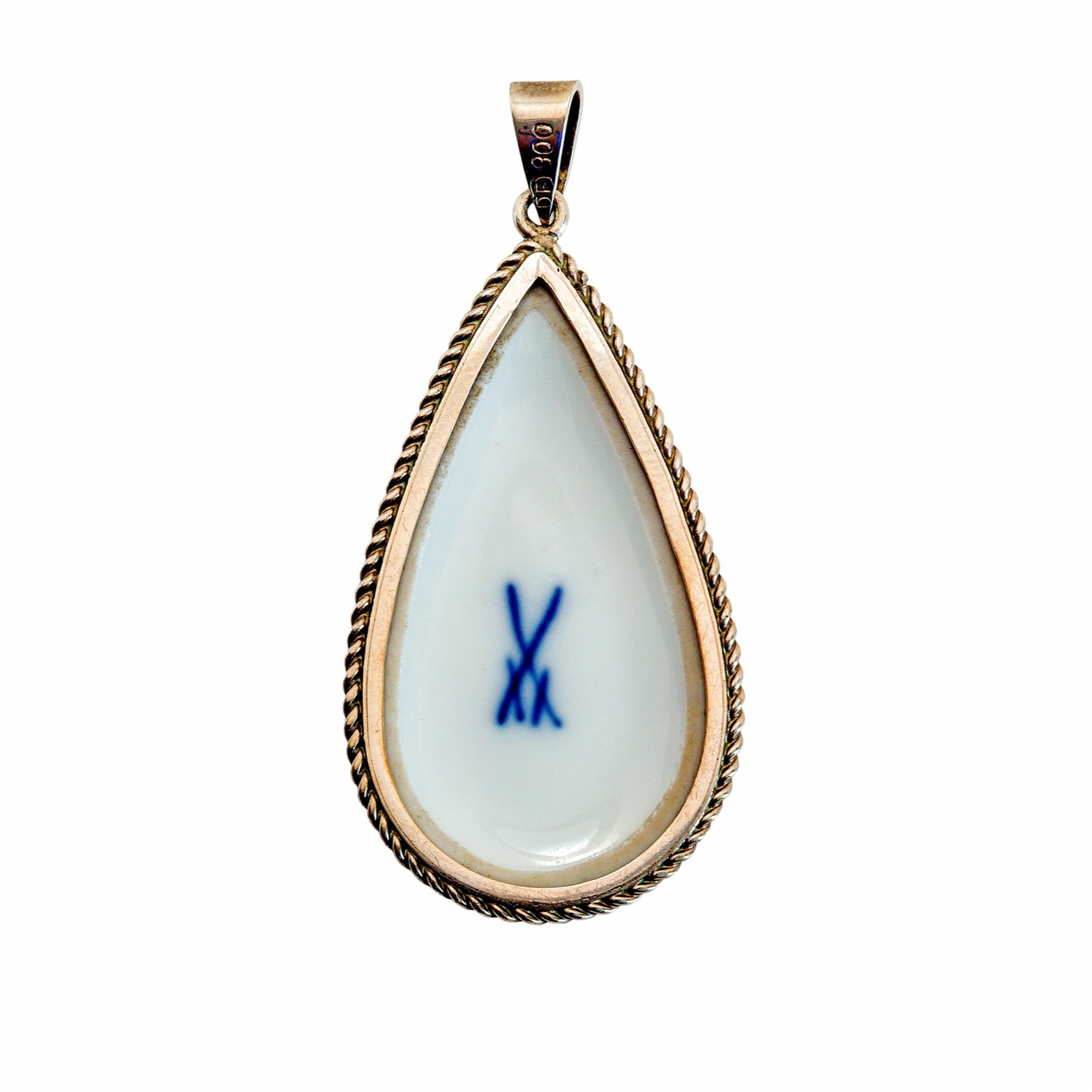 Eingefasst ist das Porzellan in eine fein gearbeitete Fassung aus 900er Silber, deren gedrehter Rand dem Anhänger zusätzliche Eleganz und Tiefe verleiht. Die silberne Öse fügt sich harmonisch in das Gesamtbild ein und ermöglicht ein angenehmes Tragen an Kette oder Reif.