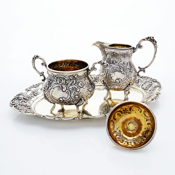 Herrliches Mokkaservice im Rokokostil gearbeitet aus der Silberwarenfabrik Ludwig Kramer aus Großauheim/Oberrodenbach, idNv. Hanau. Dieses Service besticht durch sein üppiges Dekor von Rocaillen und floralen Elementen von Blumen und Rosenblüten. Alle Teile dieses Service sind entsprechend gestempelt und diesem Set zugehörig. Unpoliert!