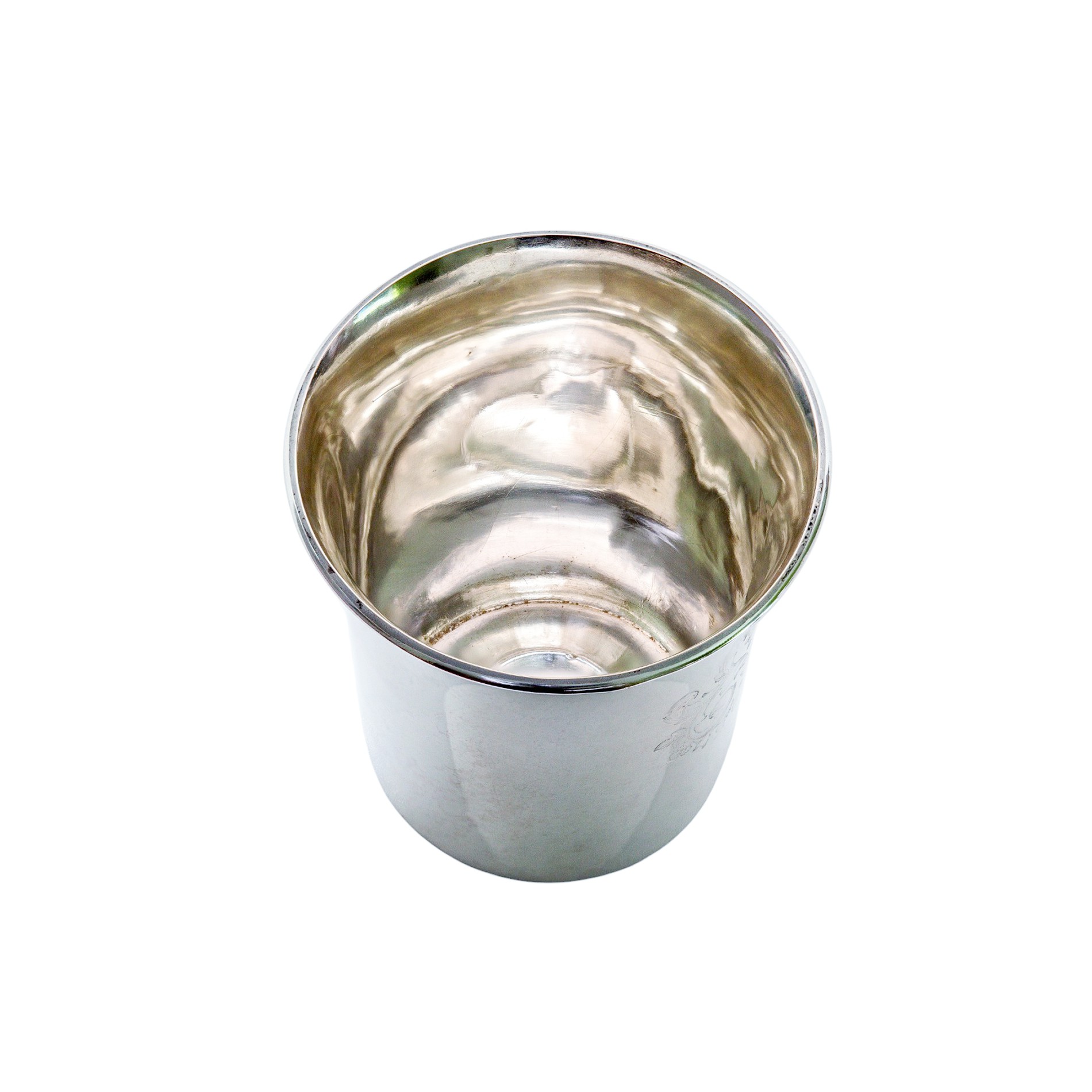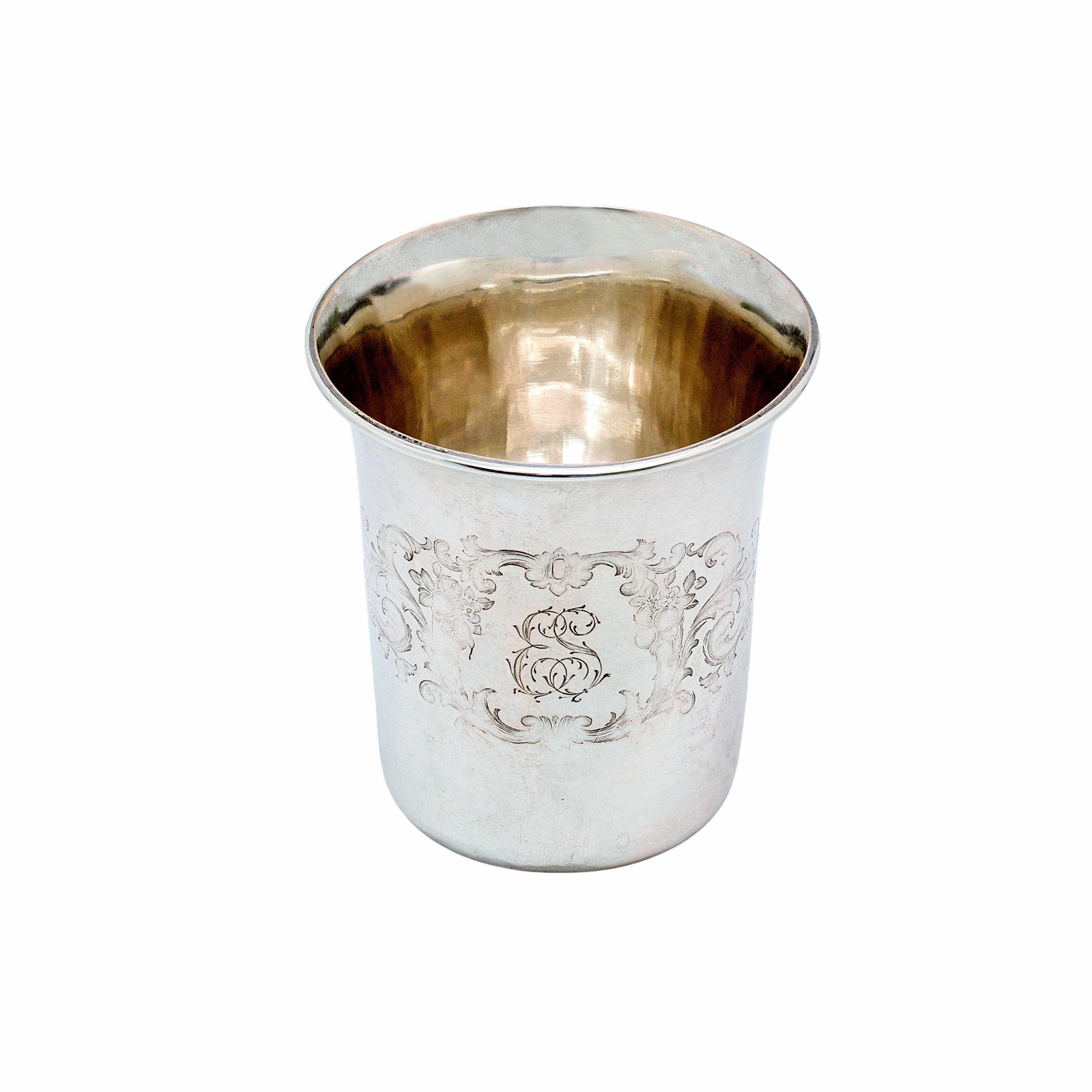 Inmitten des stilvollen Ornaments befindet sich eine kunstvolle Initialgravur „ES“, die dem Stück eine persönliche Note schenkt und seine besondere Ausstrahlung unterstreicht. Der Becher besticht durch seine harmonisch geschwungene Form und die leicht ausgestellte Randpartie, die das Design optisch abrundet.