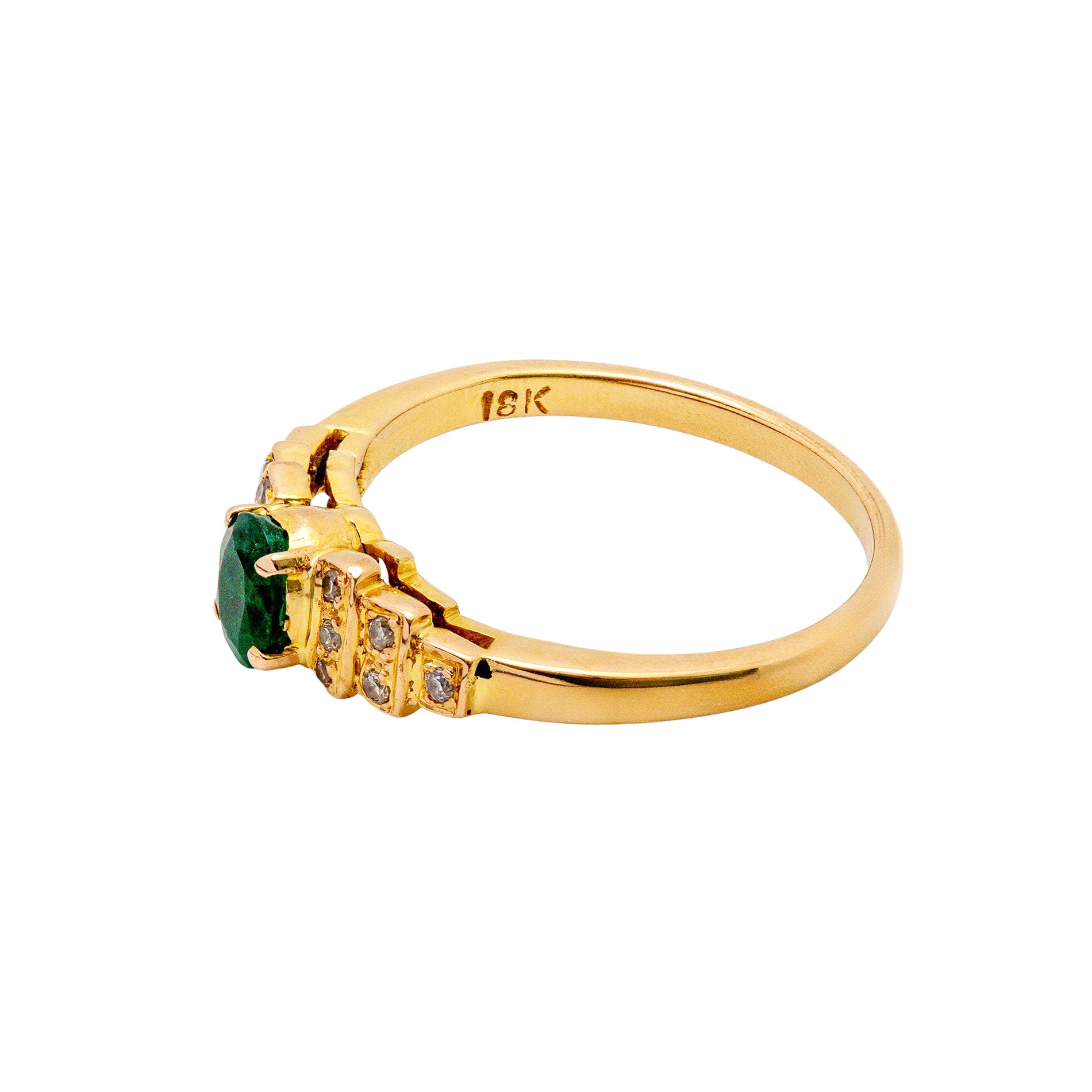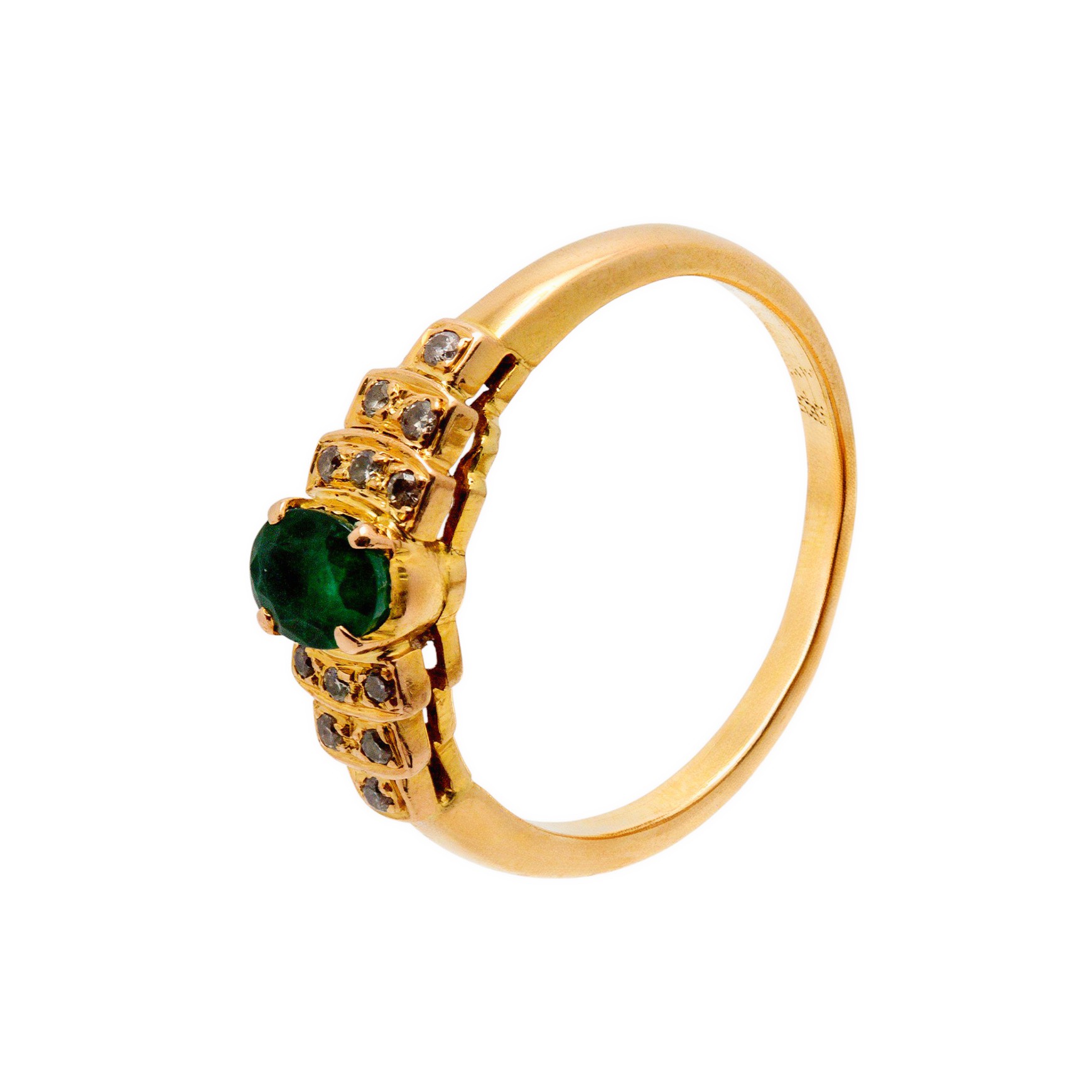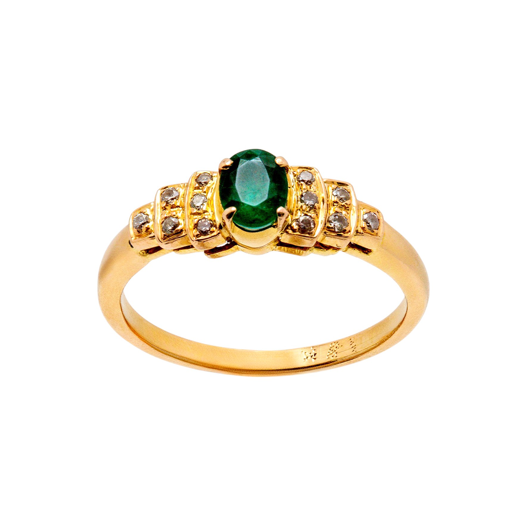 Der edle Mittelstein wird von funkelnden Diamanten eingerahmt, die in kunstvoll abgestuften Fassungen sitzen und dem Ring ein harmonisches, luxuriöses Gesamtbild verleihen. Die warme Ausstrahlung des Gelbgoldes bildet einen wunderschönen Kontrast zum leuchtenden Grün des Smaragds und dem klaren Glanz der Diamanten.