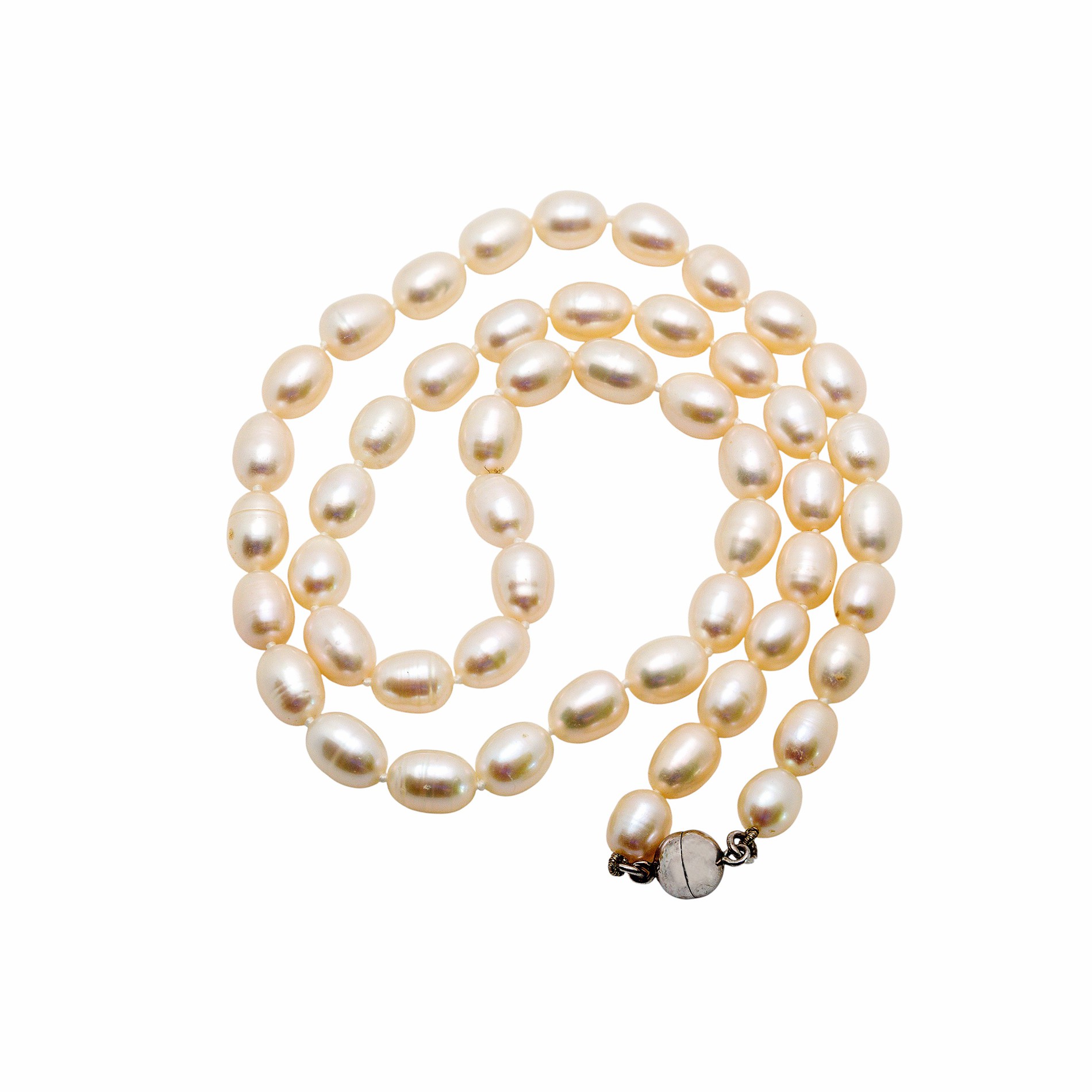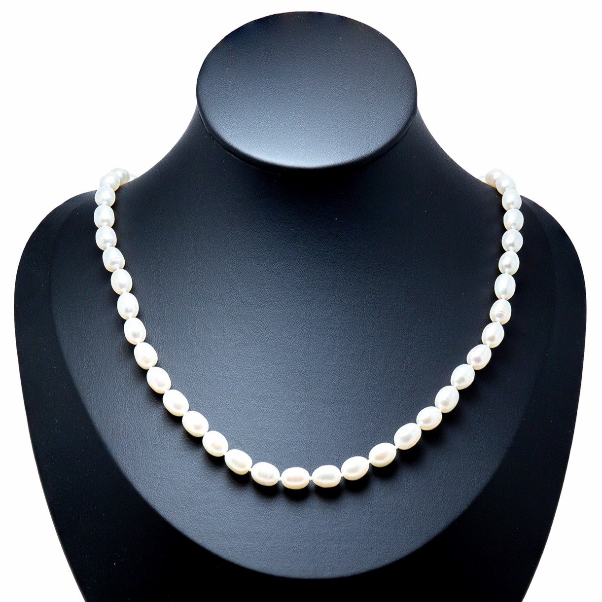 Diese elegante Süßwasserperlenkette verbindet klassische Schönheit mit moderner Raffinesse und ist ein zeitloses Schmuckstück für jeden Anlass. Die zarten, leicht ovalen Perlen begeistern mit einem sanften, natürlichen Lüster, der sich harmonisch auf der Haut widerspiegelt und jedem Outfit eine edle Note verleiht.